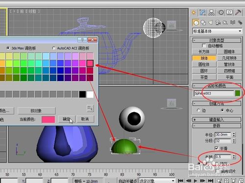 選擇對象顏色,修改球體的顏色,并將球體參數(shù)中的半球設(shè)置0.5,即顯示半球
