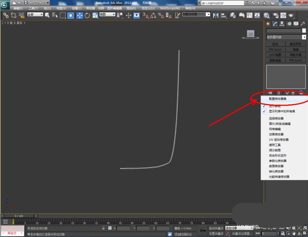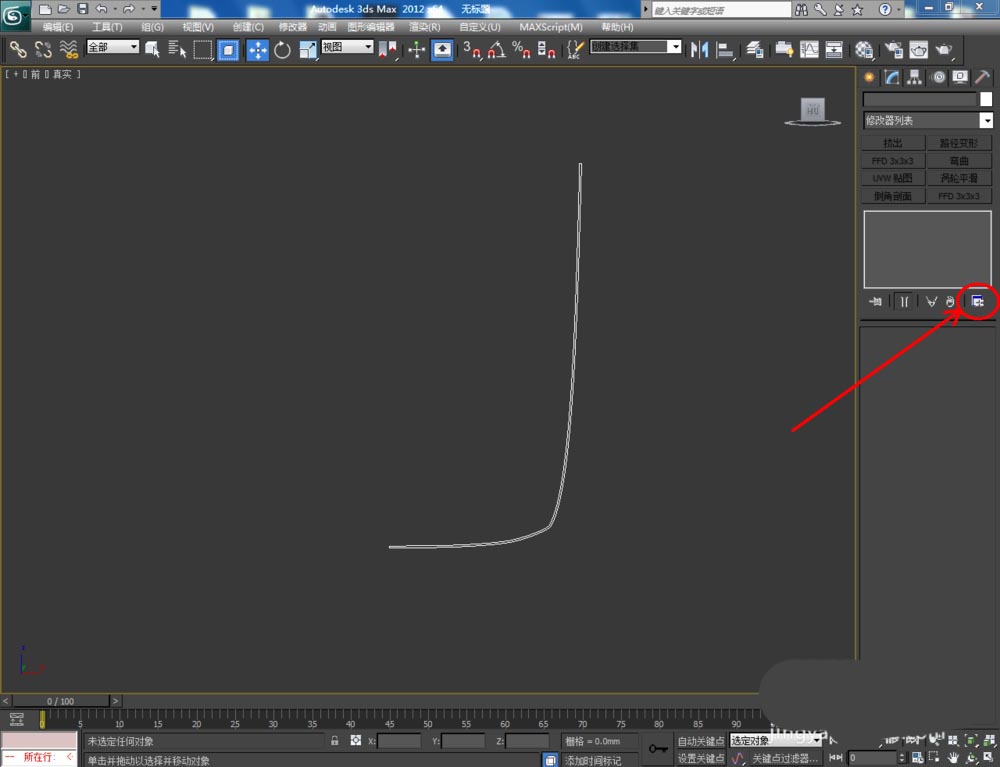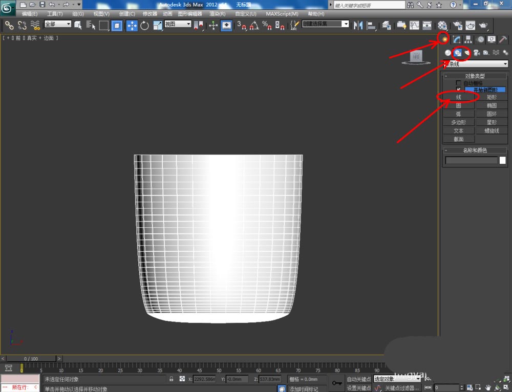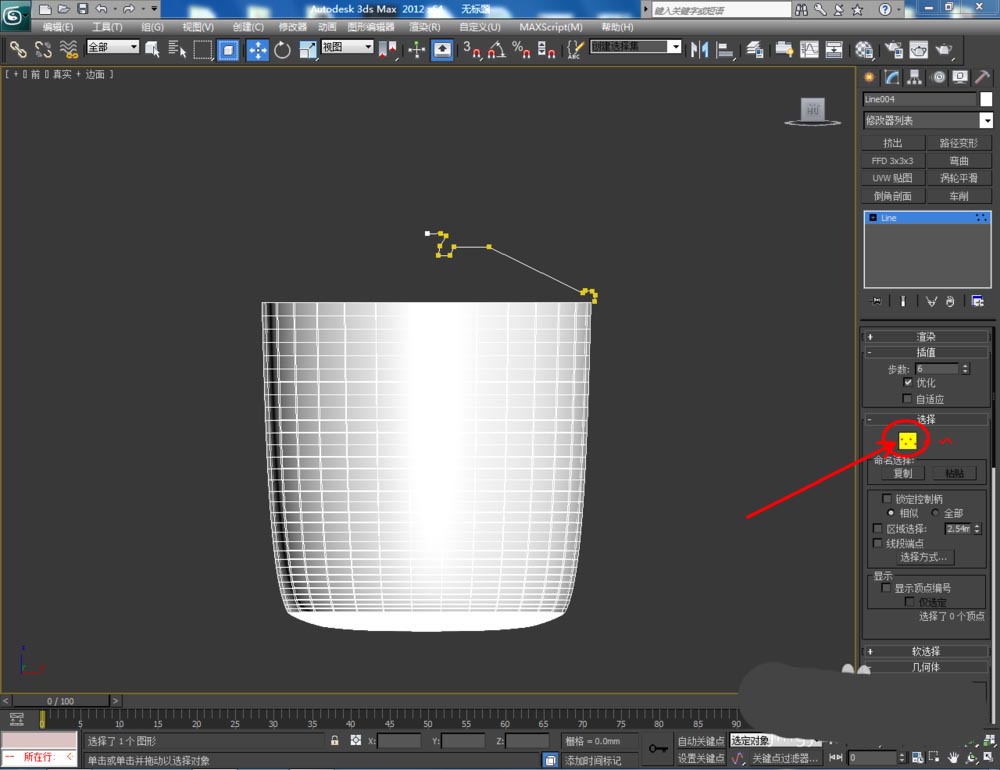 1、打開3Dmax2012軟件,點(diǎn)擊【創(chuàng)建】-【圖形】-【線】,在作圖區(qū)域繪制一個(gè)線段圖案。點(diǎn)擊右邊工作區(qū)中【頂點(diǎn)】圖標(biāo),對(duì)圖示圖案上的點(diǎn)進(jìn)行圓化處理。點(diǎn)擊【樣條線】,選取樣條線,對(duì)樣條線進(jìn)行輪廓操作(如圖所示);