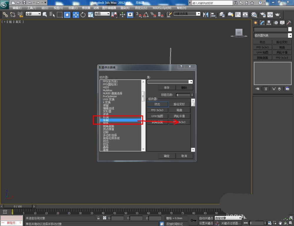 2、點(diǎn)擊【修改】-【配置修改器集】,彈出配置修改器集設(shè)置欄,找到【車削】并將其拉動(dòng)到右邊選項(xiàng)框中,點(diǎn)擊【確定】將車削調(diào)出。選中圖案,點(diǎn)擊【車削】并按圖示設(shè)置好車削的各個(gè)參數(shù);