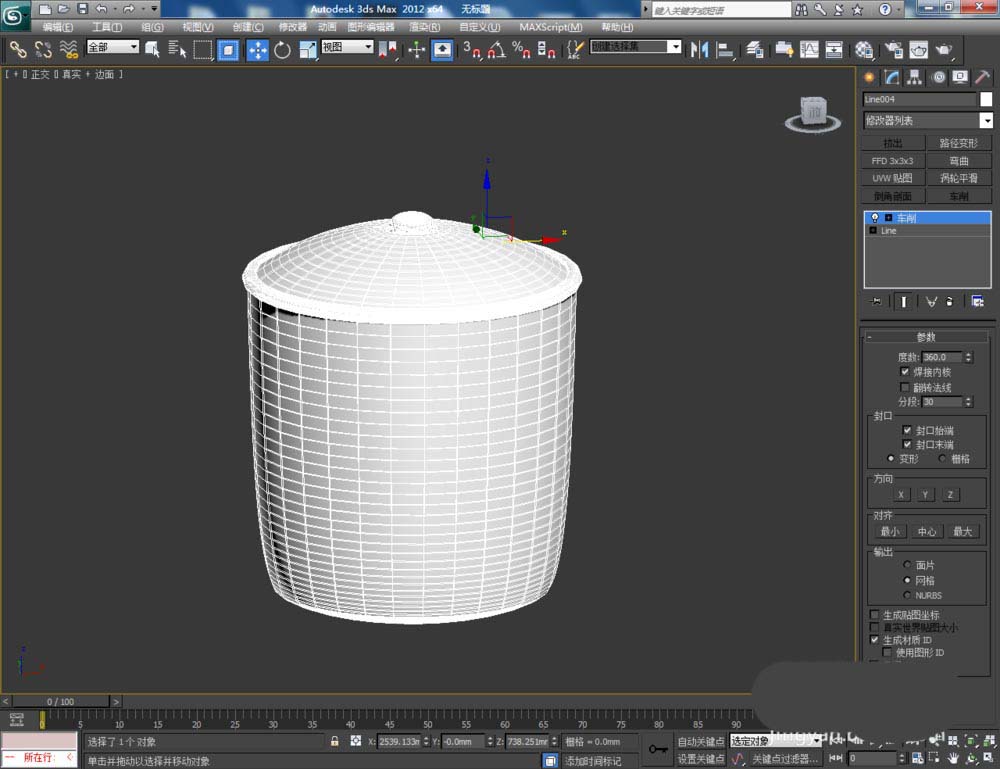 4、選中圖案,點(diǎn)擊【車(chē)削】,勾選【焊接內(nèi)核】并將對(duì)齊設(shè)置為:最小,分段數(shù)設(shè)置為:30后,制作出蒸汽消毒器的蓋子模型(如圖所示);