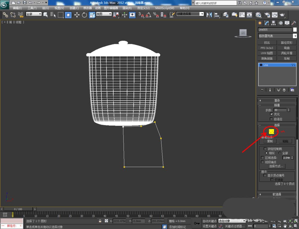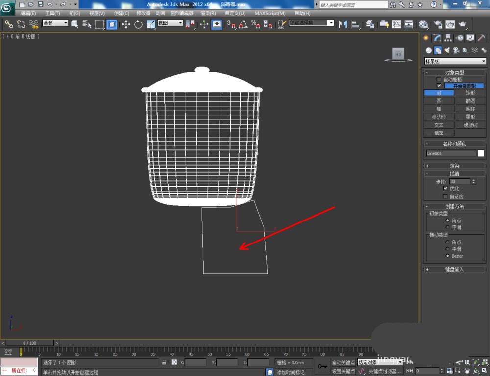 1、打開(kāi)3Dmax2012軟件,點(diǎn)擊【創(chuàng)建】-【圖形】-【線】,在作圖區(qū)域繪制一個(gè)線段圖案。點(diǎn)擊右邊工作區(qū)中【頂點(diǎn)】圖標(biāo),對(duì)圖示圖案上的點(diǎn)進(jìn)行圓化處理。點(diǎn)擊【樣條線】,選取樣條線,對(duì)樣條線進(jìn)行輪廓操作(如圖所示);