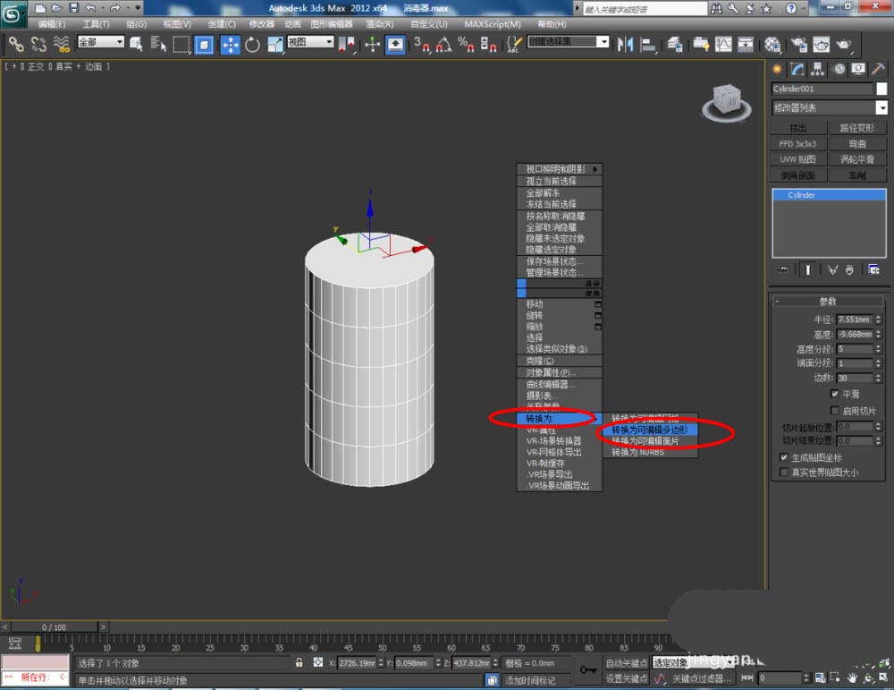 6、點(diǎn)擊【創(chuàng)建】-【幾何體】-【圓柱體】,繪制一個(gè)圓柱體模型后,點(diǎn)擊鼠標(biāo)右鍵-【轉(zhuǎn)換為】-【轉(zhuǎn)換為可編輯多邊形】,按圖示操作完成四個(gè)器腳模型的制作。最后給模型附加上材質(zhì)后,我們的蒸汽消毒器模型便全部制作完成。