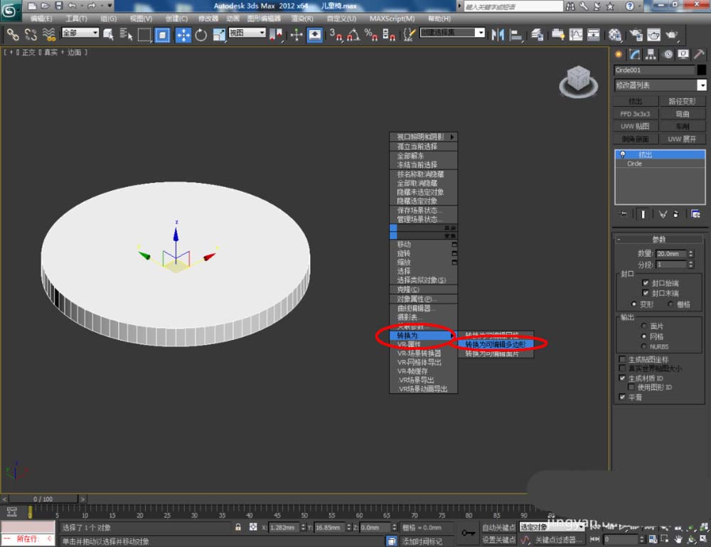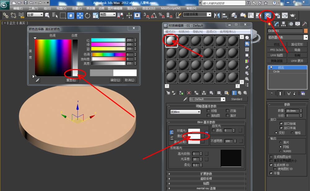 2、選中圓形圖案,點擊【修改】-【擠出】,按圖示設(shè)置好擠出的各個參數(shù)后,點擊【材質(zhì)編輯器】,按圖示設(shè)置一個白色材質(zhì)球并附加給模型。選中模型,點擊【對象顏色】將模型的對象顏色設(shè)置為:黑色;