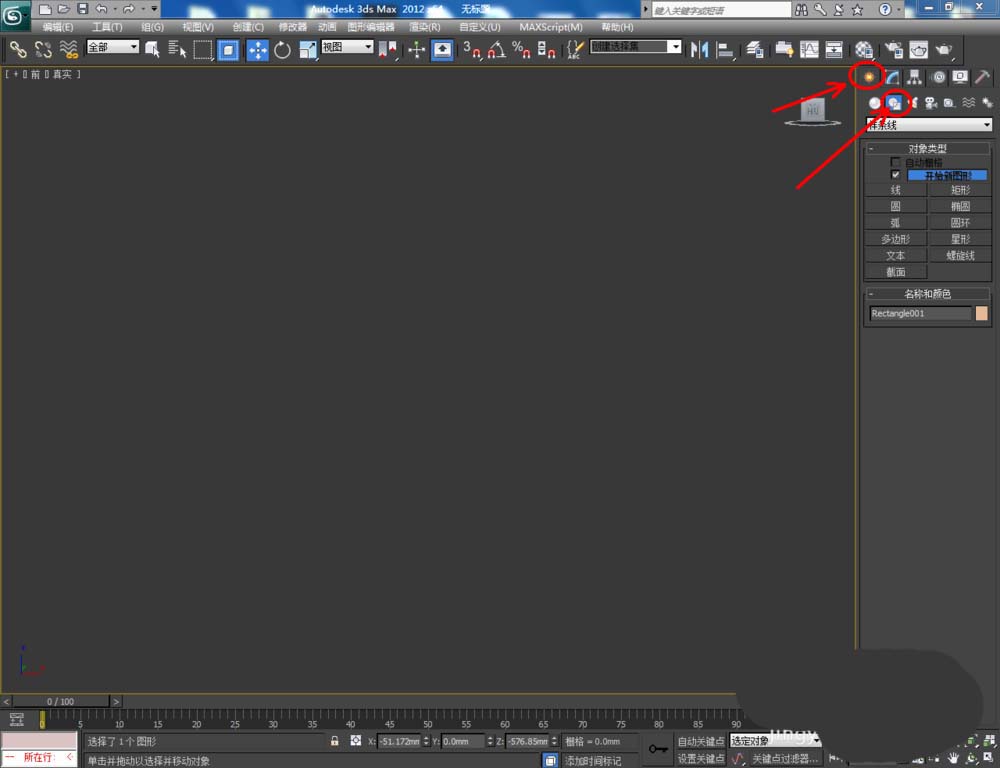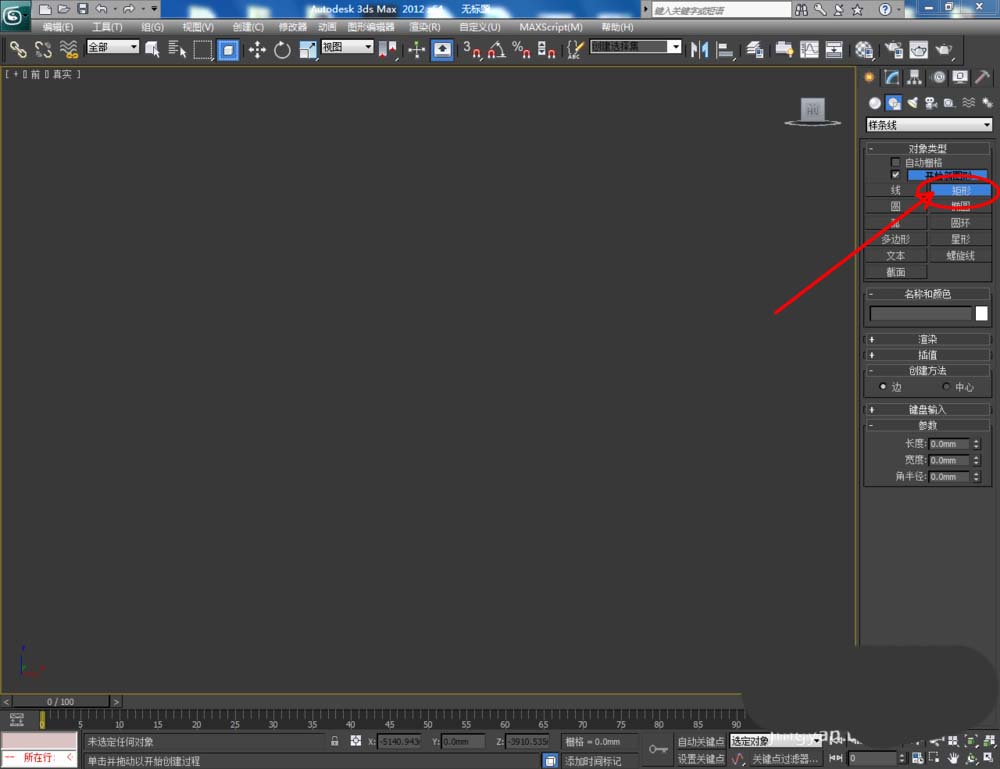 1、打開3Dmax2012軟件,點擊【創(chuàng)建】-【圖形】-【矩形】,在作圖區(qū)域繪制一個200*200mm的矩形圖案作為參考線框。選中圖案,點擊【對象顏色】將圖案的對象顏色設(shè)置為:白色;