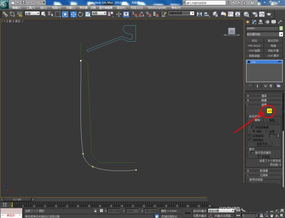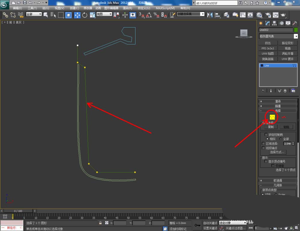 3、選中圖案1,點擊右邊工作區(qū)中的【頂點】圖標(biāo),選中圖示圖案上的點后進(jìn)行圓化處理和位置調(diào)整。點擊【樣條線】圖標(biāo),選中所有樣條線后,對其進(jìn)行輪廓處理(如圖所示);