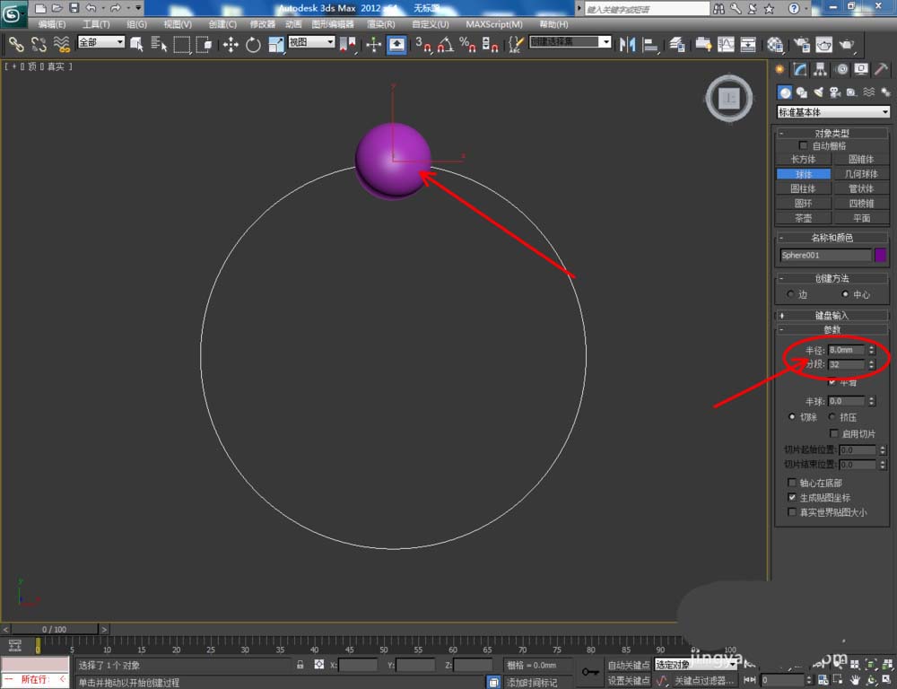 2、點(diǎn)擊【創(chuàng)建】-【幾何體】-【球體】,畫(huà)好第一顆珠子,球半徑設(shè)為:8mm。選中珠子,點(diǎn)擊【對(duì)象顏色】將珠子的對(duì)象顏色設(shè)置為:白色;