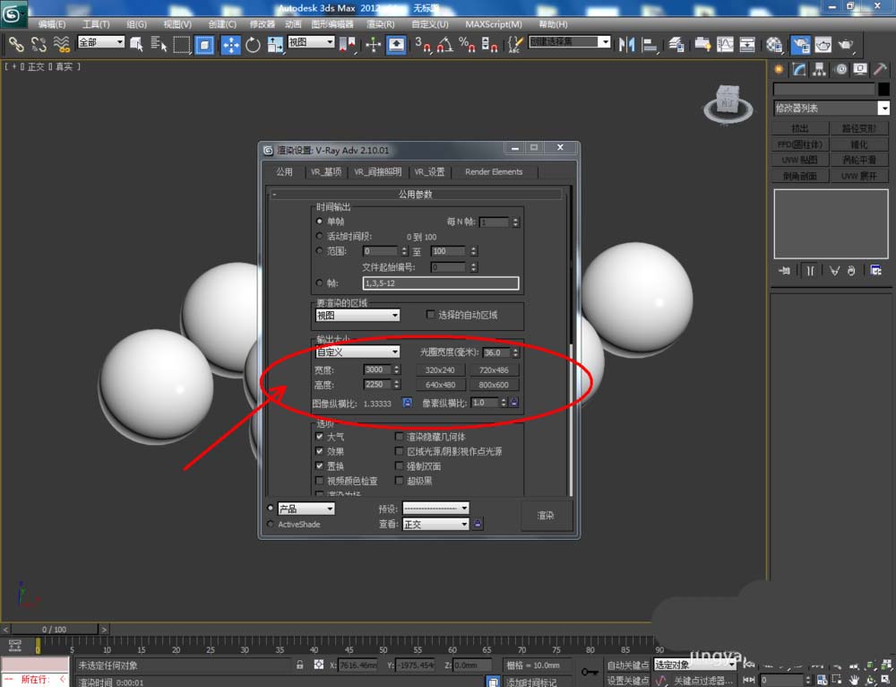 5、點(diǎn)擊【渲染】-【渲染設(shè)置】,彈出渲染設(shè)置對話框,按圖示設(shè)置好輸出大小參數(shù)后,點(diǎn)擊【渲染】將附好珍珠材質(zhì)的模型渲染出圖即可。