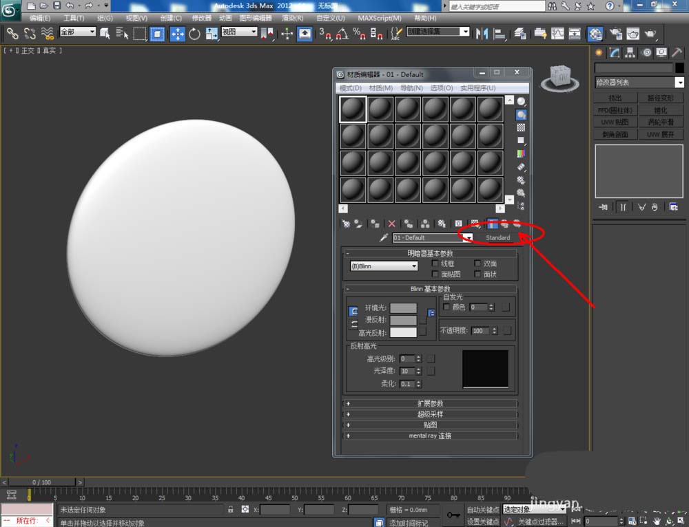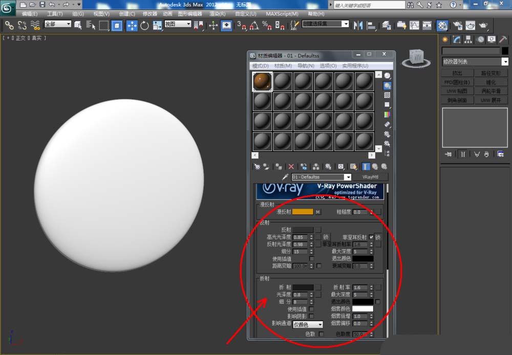 4、點擊【材質(zhì)編輯器】,彈出材質(zhì)編輯器設(shè)置框,點擊【standard】-【VAryMlt】設(shè)置一個Vary材質(zhì)球,按圖示設(shè)置好【反射】與【折射】中的各個參數(shù),制作出一個黃玉材質(zhì)球并添加一張黃玉貼圖。完成后將材質(zhì)球附加給模型(如圖所示);