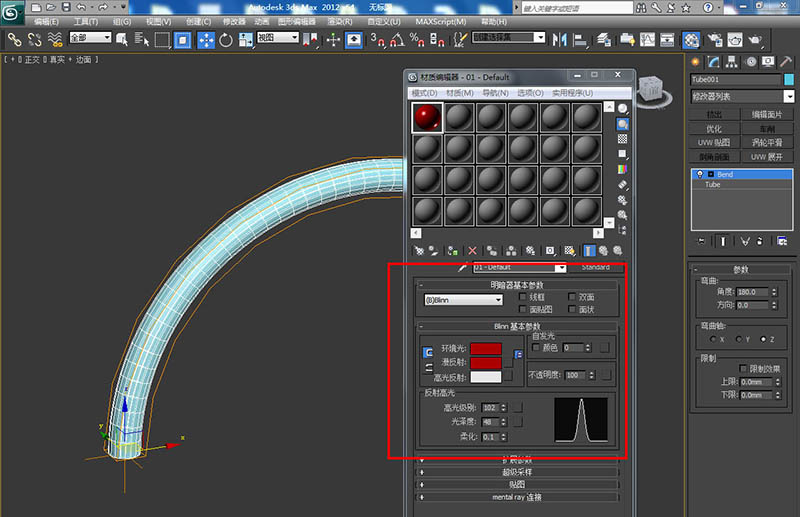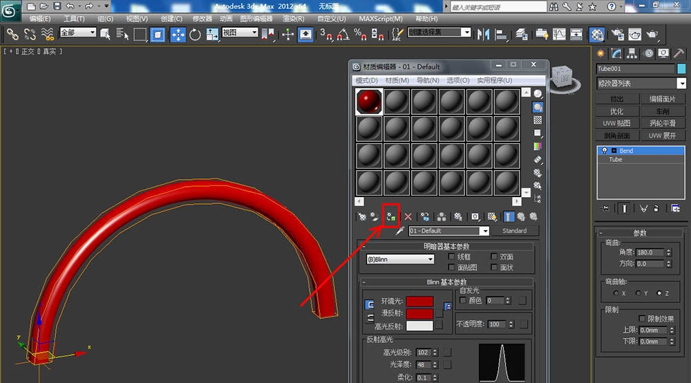 5、最后,點擊【材質(zhì)編輯器】,為通過彎曲操作制作出來的模型添加上材質(zhì)即可。以上就是關(guān)于3Dmax怎么彎曲的所有介紹。