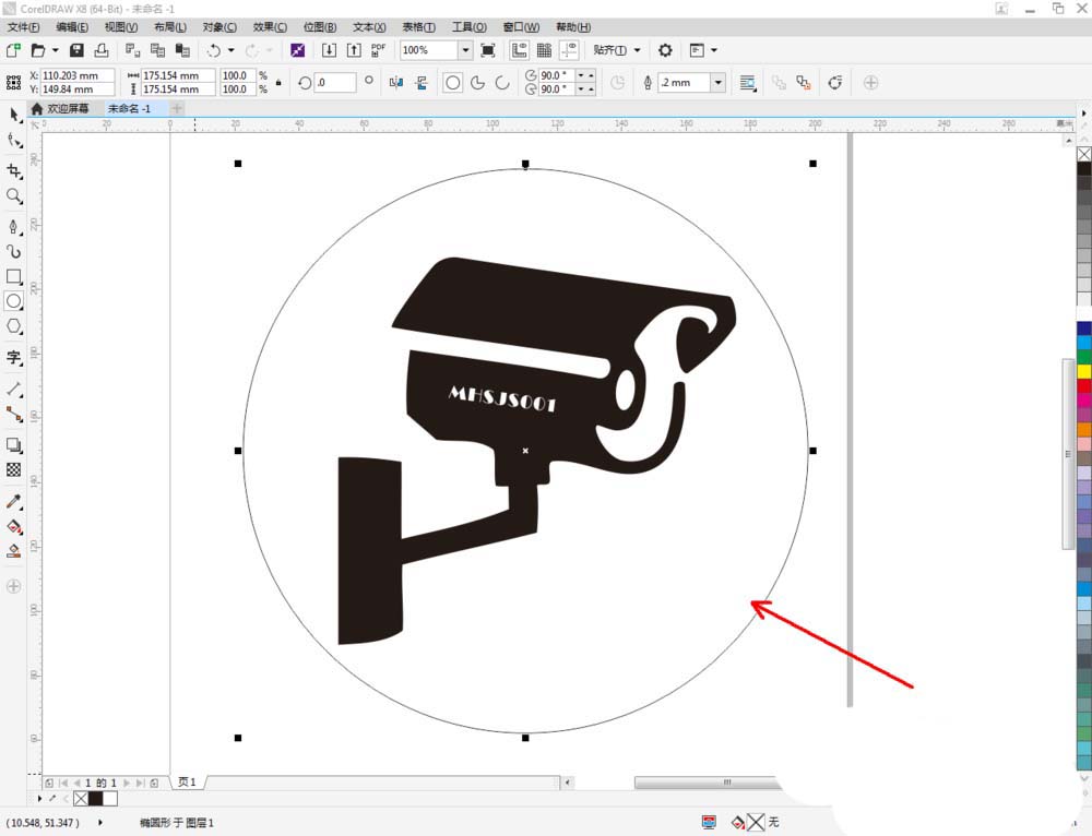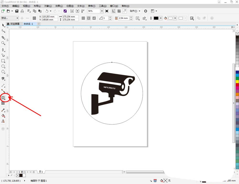 5、點(diǎn)擊【橢圓形工具】,在作圖區(qū)域繪制一個(gè)圓框。點(diǎn)擊【輪廓圖】對(duì)圓形圖案進(jìn)行輪廓后,點(diǎn)擊鼠標(biāo)右鍵-【拆分輪廓圖群組】,將兩個(gè)圖案拆分并分別設(shè)置好圓框的輪廓寬度。這樣我們整個(gè)監(jiān)控圖標(biāo)便全部制作完成。