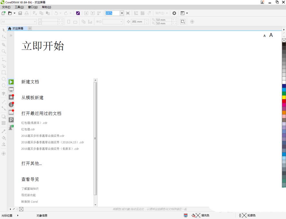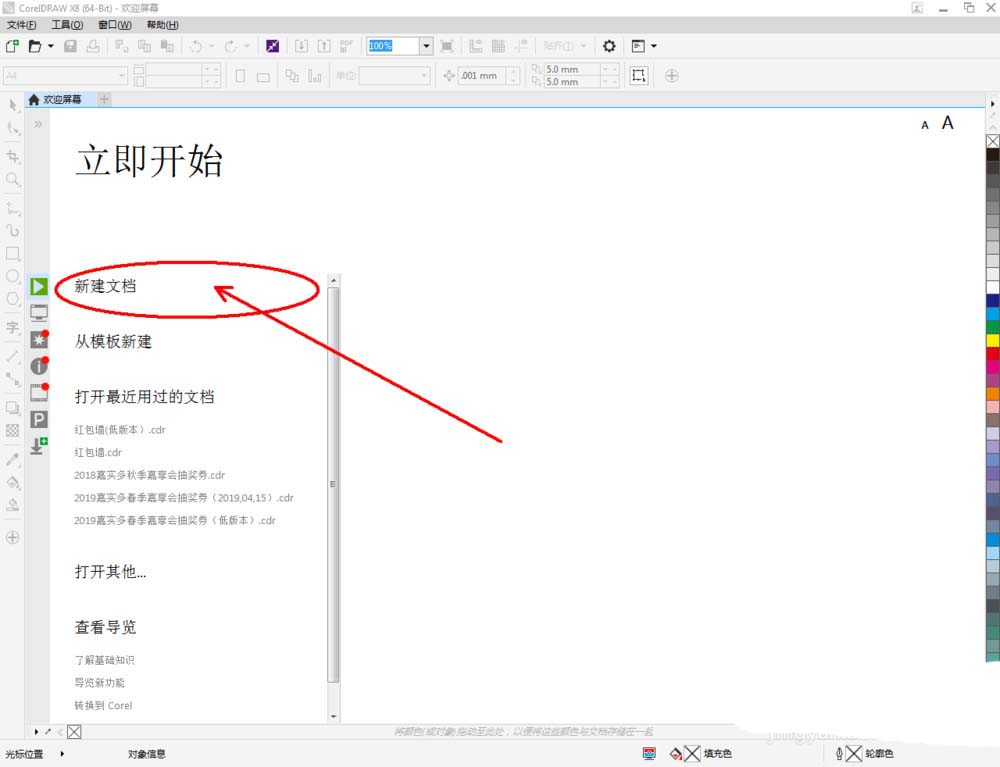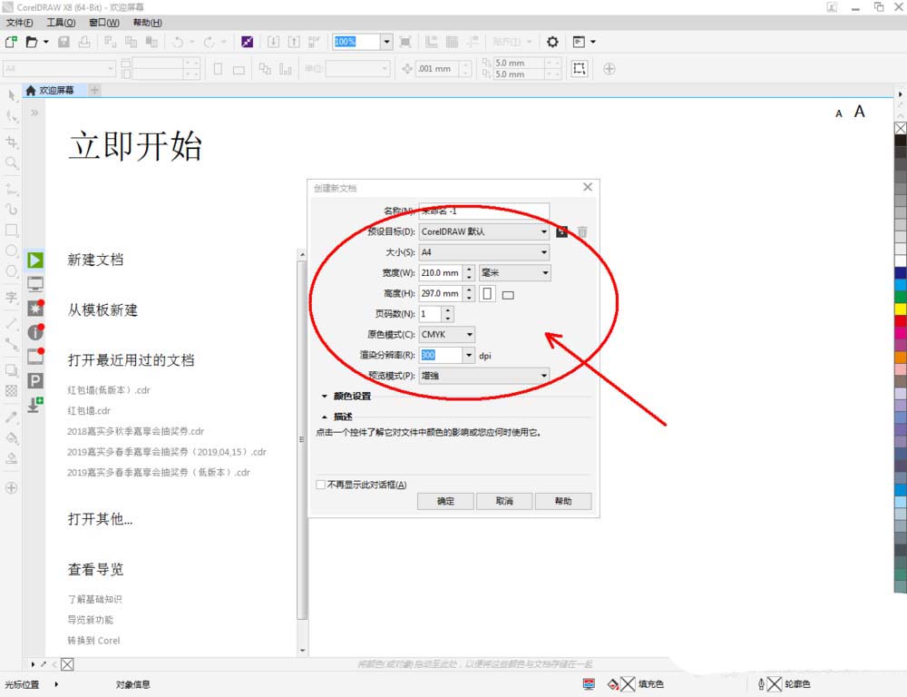 1、打開CorelDRAW X8 軟件,點(diǎn)擊【新建文檔】,按圖示參數(shù)新建一個(gè)cdr文檔(如圖所示);