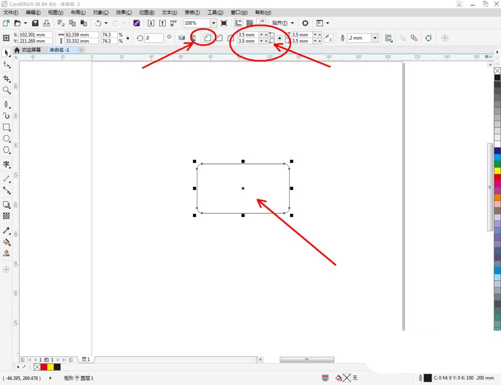 2、點(diǎn)擊【矩形工具】,按圖示設(shè)置好圓角的參數(shù)后,在作圖區(qū)域繪制一個(gè)圓角矩形圖案。完成后,按圖示繪制出另外三個(gè)直角矩形圖案(如圖所示);