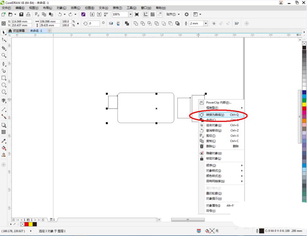 3、選中三個(gè)直角矩形圖案,點(diǎn)擊鼠標(biāo)右鍵-【轉(zhuǎn)化為曲線】將矩形轉(zhuǎn)曲后,點(diǎn)擊【變形工具】,按圖示對(duì)圖案上的節(jié)點(diǎn)進(jìn)行位置調(diào)整(如圖所示);