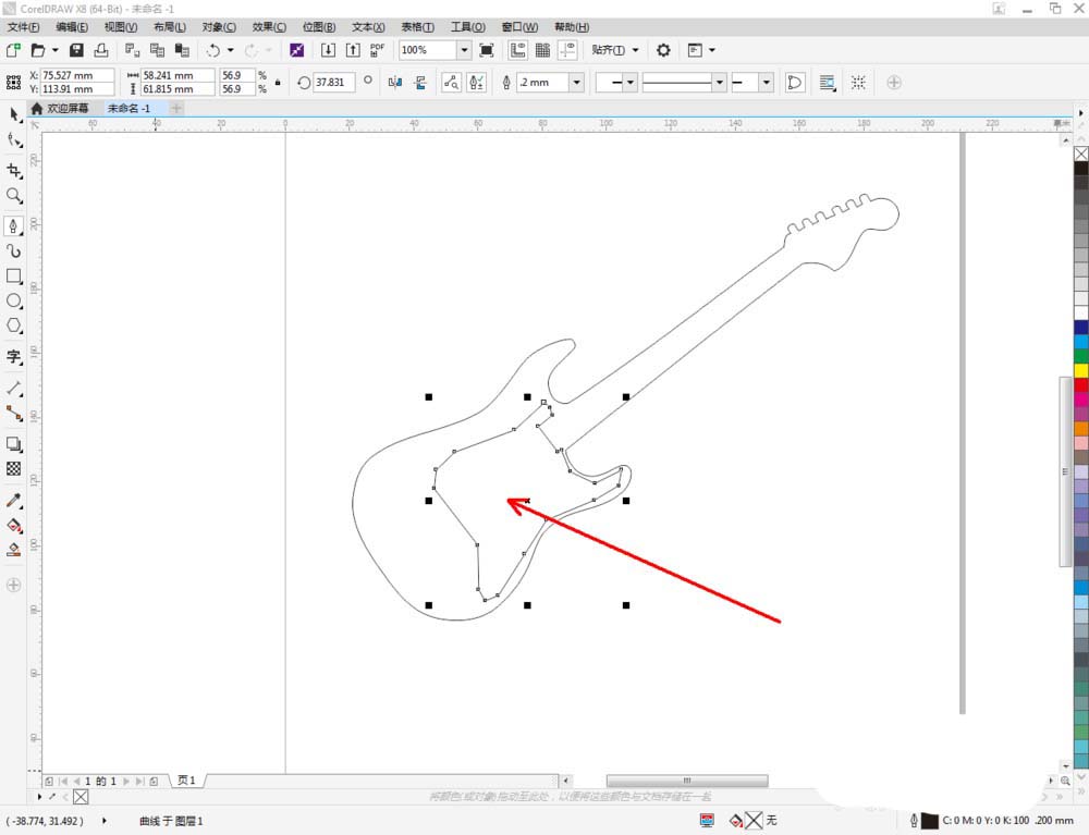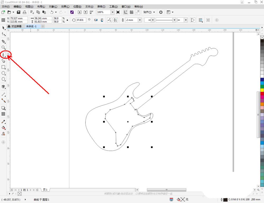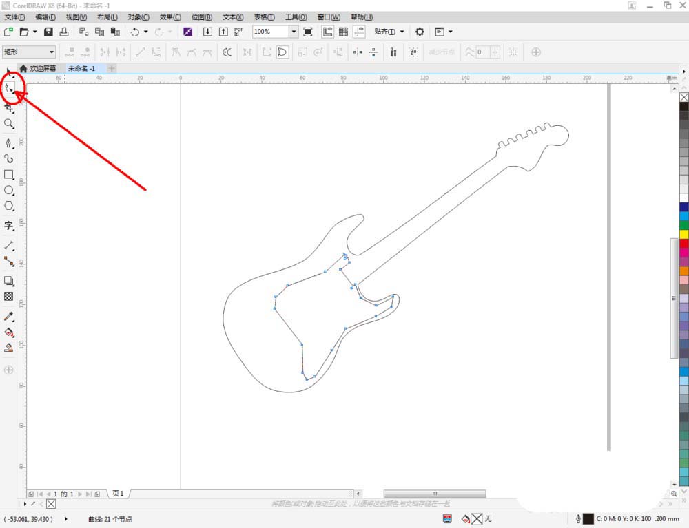 3、選中琴體圖案,點(diǎn)擊【形狀工具】,選中圖案上的所有點(diǎn),點(diǎn)擊【轉(zhuǎn)換為曲線】將圖案轉(zhuǎn)曲后,按圖示調(diào)整控制點(diǎn),完成整個(gè)琴體輪廓圖案的繪制(如圖所示);