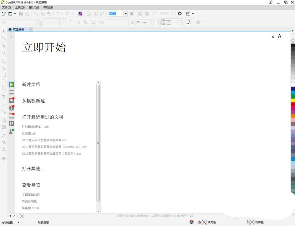1、打開(kāi)CorelDRAW X8 軟件,點(diǎn)擊【新建文檔】,按圖示參數(shù)新建一個(gè)cdr文檔(如圖所示);