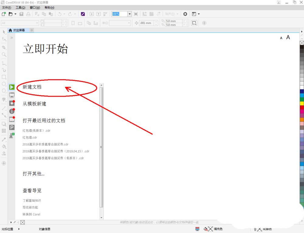 1、打開(kāi)CorelDRAW X8 軟件,點(diǎn)擊【新建文檔】,按圖示參數(shù)新建一個(gè)cdr文檔(如圖所示);