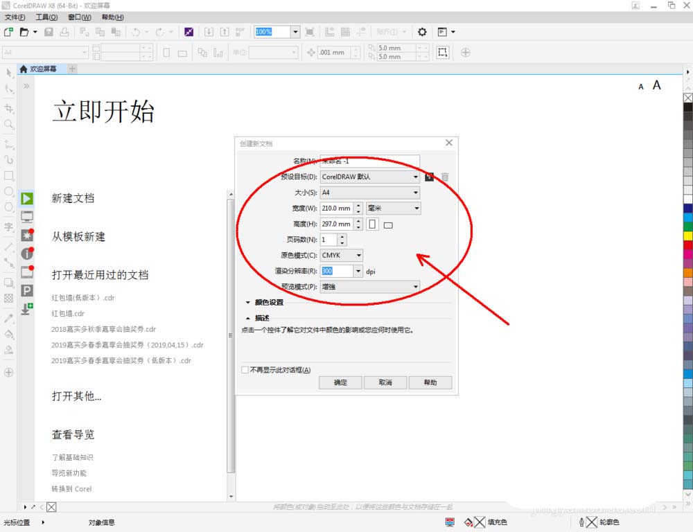 1、打開CorelDRAW X8 軟件,點(diǎn)擊【新建文檔】,按圖示參數(shù)新建一個(gè)cdr文檔(如圖所示);