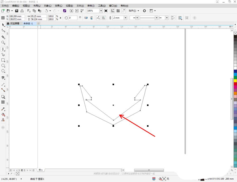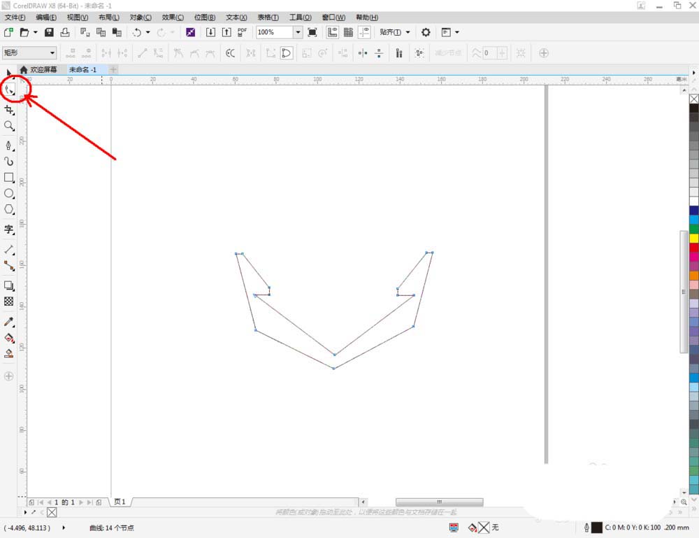 2、點(diǎn)擊【鋼筆工具】,按圖示繪制出一個(gè)多邊圖案。點(diǎn)擊【形狀工具】選中圖案上的所有點(diǎn),點(diǎn)擊【轉(zhuǎn)化為曲線】后,選中圖示圖案上的節(jié)點(diǎn),點(diǎn)擊【平滑節(jié)點(diǎn)】將節(jié)點(diǎn)進(jìn)行平滑處理并調(diào)整好控制點(diǎn)(如圖所示);