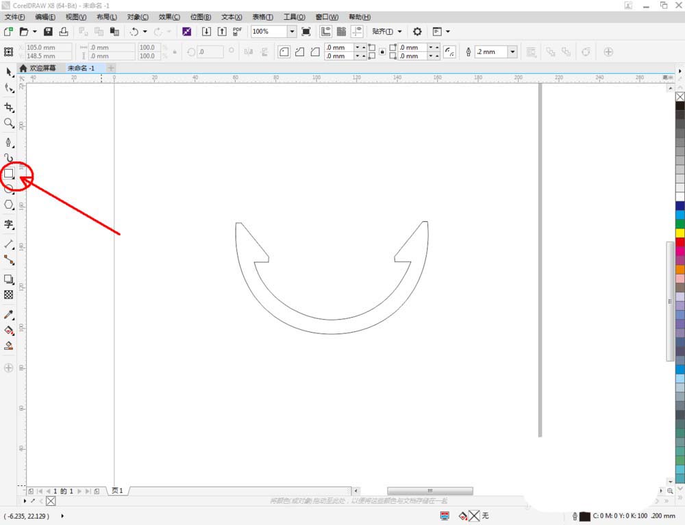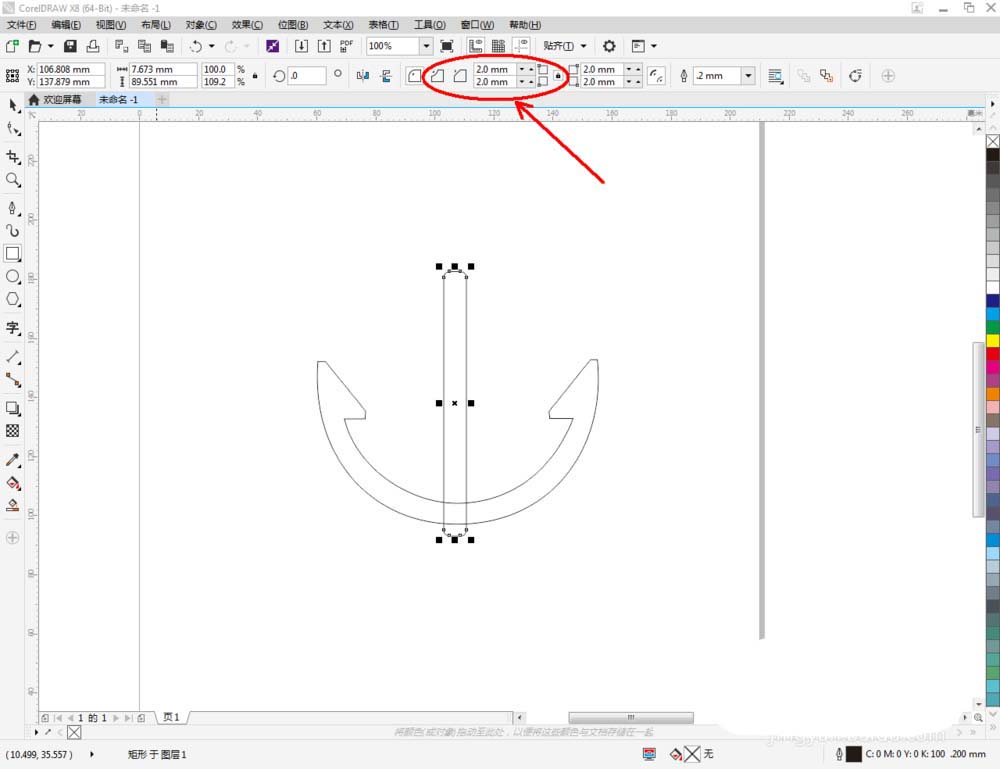 3、點(diǎn)擊【矩形工具】,按圖示在作圖區(qū)域繪制一個(gè)豎向矩形圖案,點(diǎn)擊【圓角】圖標(biāo)并設(shè)置好圓角參數(shù)。完成后,繪制一個(gè)橫向直角矩形圖案,調(diào)整好圖像間的位置關(guān)系(如圖所示);