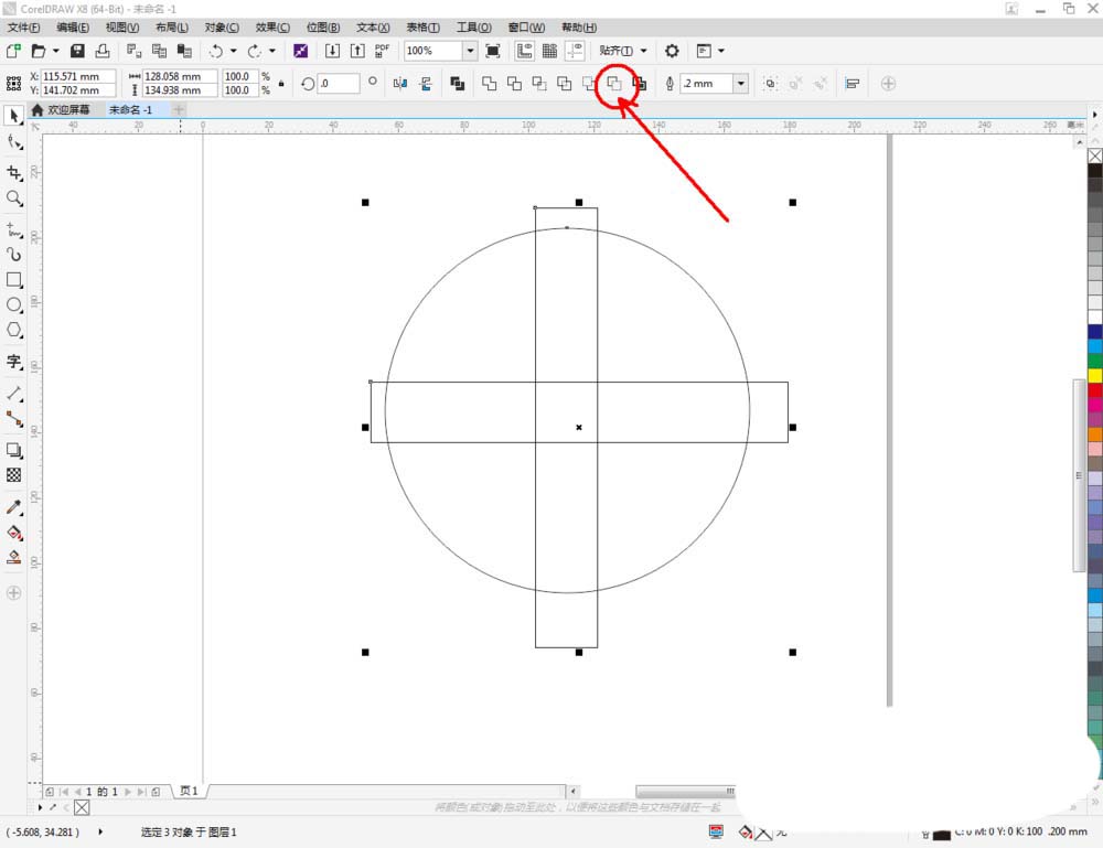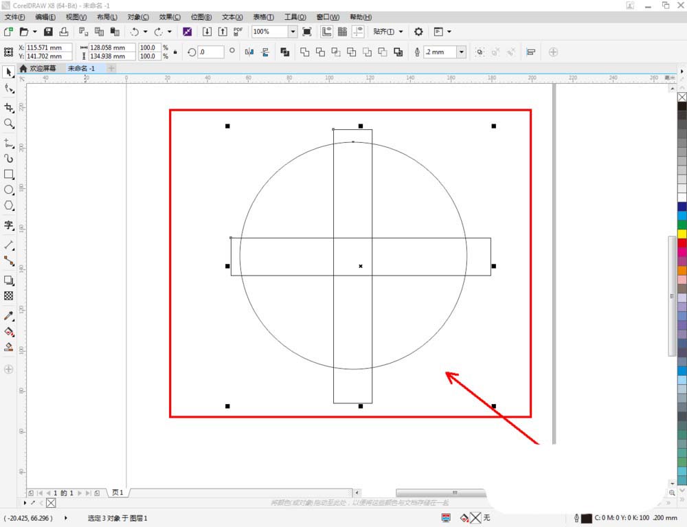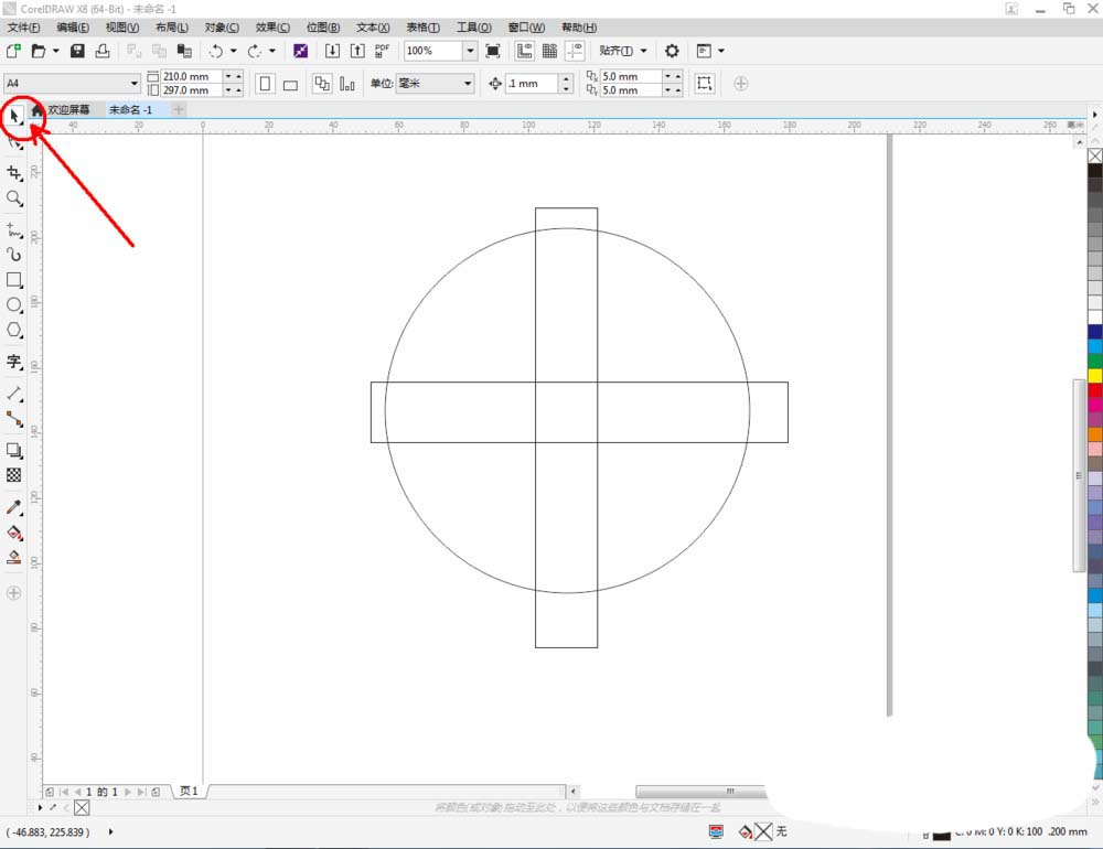 2、點(diǎn)擊【橢圓形工具】在作圖區(qū)域繪制一個(gè)圓形圖案后,點(diǎn)擊【矩形工具】繪制出一個(gè)橫向矩形圖案和一個(gè)縱向矩形圖案。完成后,調(diào)整好圖案間的位置關(guān)系(如圖所示);