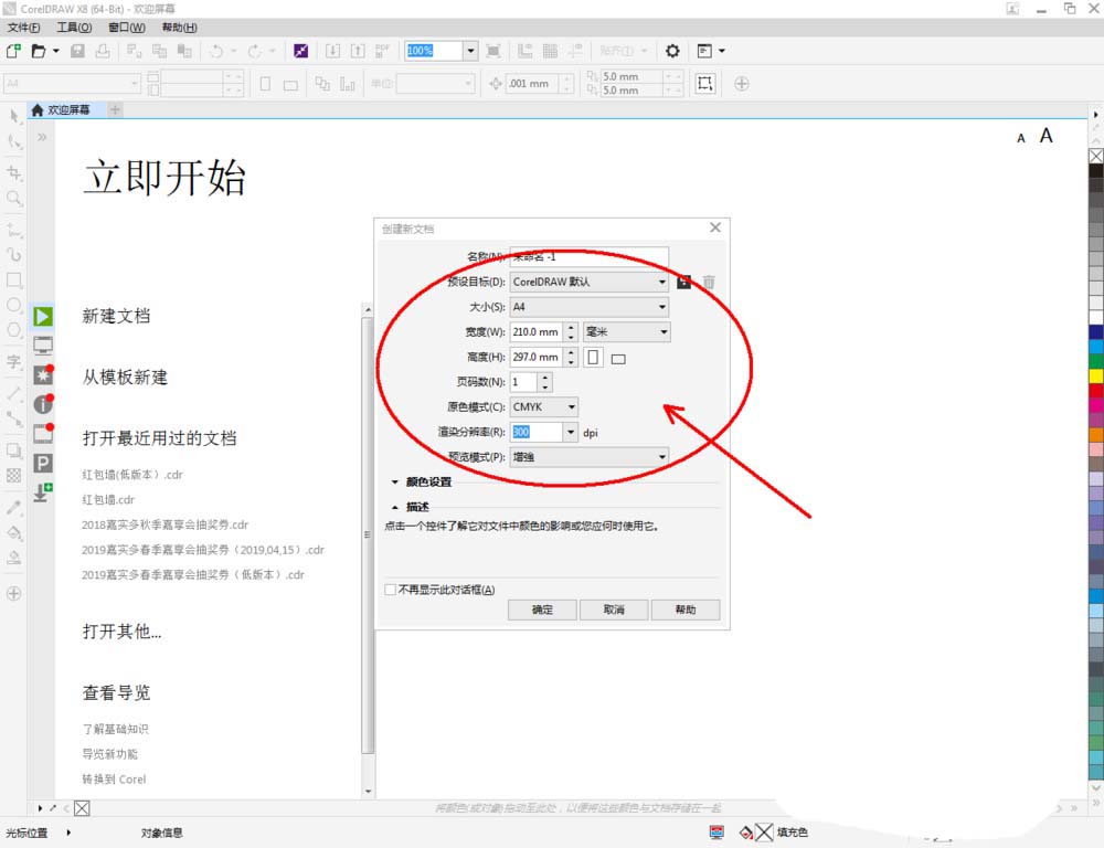 1、打開CorelDRAW X8 軟件,點擊【新建文檔】,按圖示參數(shù)新建一個cdr文檔(如圖所示);