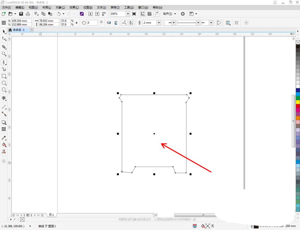 2、點擊【鋼筆工具】按圖示在作圖區(qū)域繪制出一個多邊圖案。點擊【形狀工具】,框選所有的節(jié)點后,點擊【轉(zhuǎn)化為曲線】將節(jié)點轉(zhuǎn)曲。完成后,選中圖示圖案上的節(jié)點,點擊【平滑節(jié)點】將節(jié)點進行平滑處理并調(diào)整好控制點(如圖所示);
