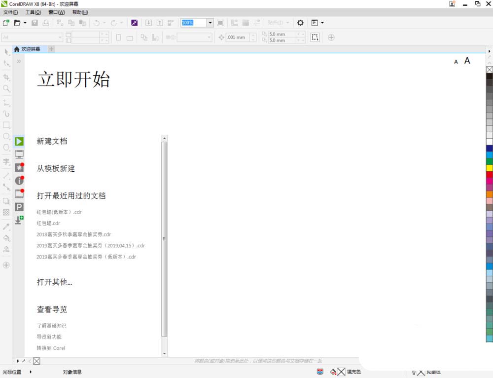 1、打開(kāi)CorelDRAW X8 軟件,點(diǎn)擊【新建文檔】,按圖示參數(shù)新建一個(gè)cdr文檔(如圖所示);