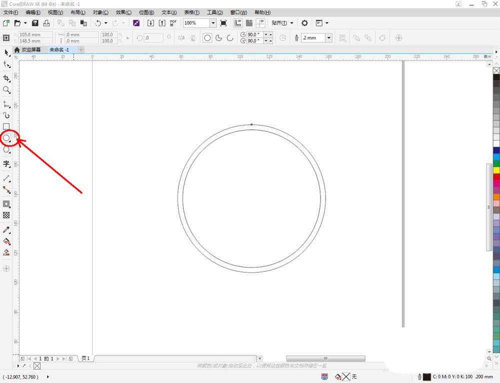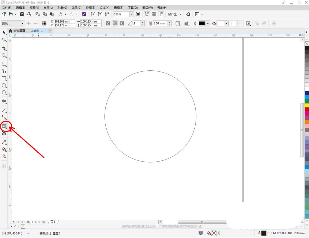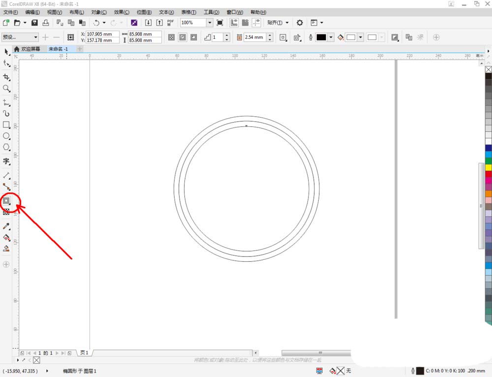 2、點(diǎn)擊【橢圓形工具】在作圖區(qū)域繪制一個(gè)圓形圖案。點(diǎn)擊【輪廓圖】拉動(dòng)圓形圖案進(jìn)行輪廓處理后,點(diǎn)擊鼠標(biāo)右鍵-【拆分輪廓圖群組】將圖案拆分(如圖所示);