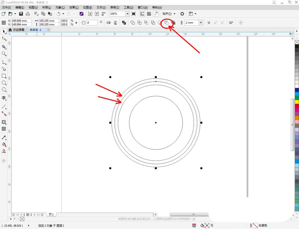 4、點擊【選擇工具】選中外圈兩個圓形圖案,點擊【移除前面對象】將前面的圓形圖案部分移除;選中內(nèi)圈兩圓形圖案,同樣點擊【移除前面對象】將前面的圓圖案移除。完成后,選中所有圖案,點擊【合并】將圖案合并為一體(如圖所示);