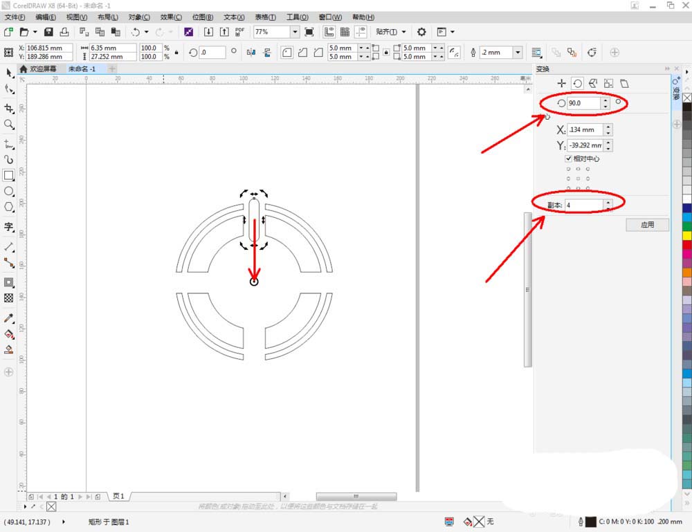 6、點擊【矩形工具】按圖示參數(shù)繪制一個圓角矩形圖案。點出變形設置框,按圖示設置好各個參數(shù)后,完成圓角矩形圖案的環(huán)形陣列操作。點擊【選擇工具】框線所有圖案后,點擊【合并】將圖案合并為一體并將其填充為黑色,這樣我們的瞄準圖標便全部制作完成了。