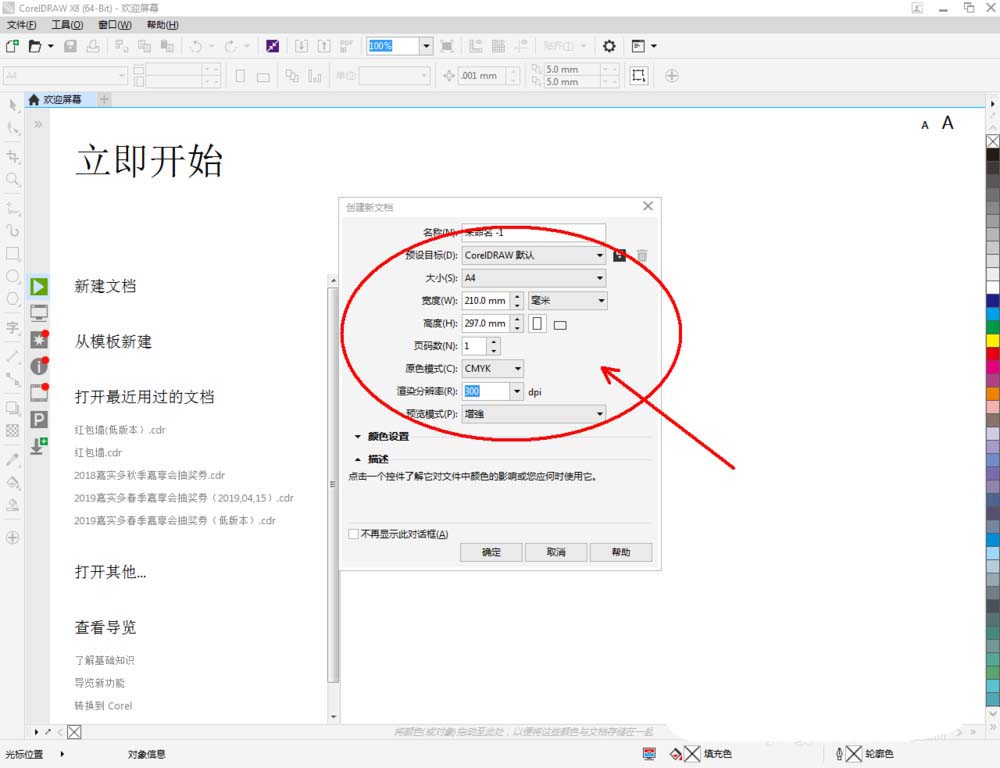 1、打開CorelDRAW X8 軟件,點(diǎn)擊【新建文檔】,按圖示參數(shù)新建一個(gè)cdr文檔(如圖所示);