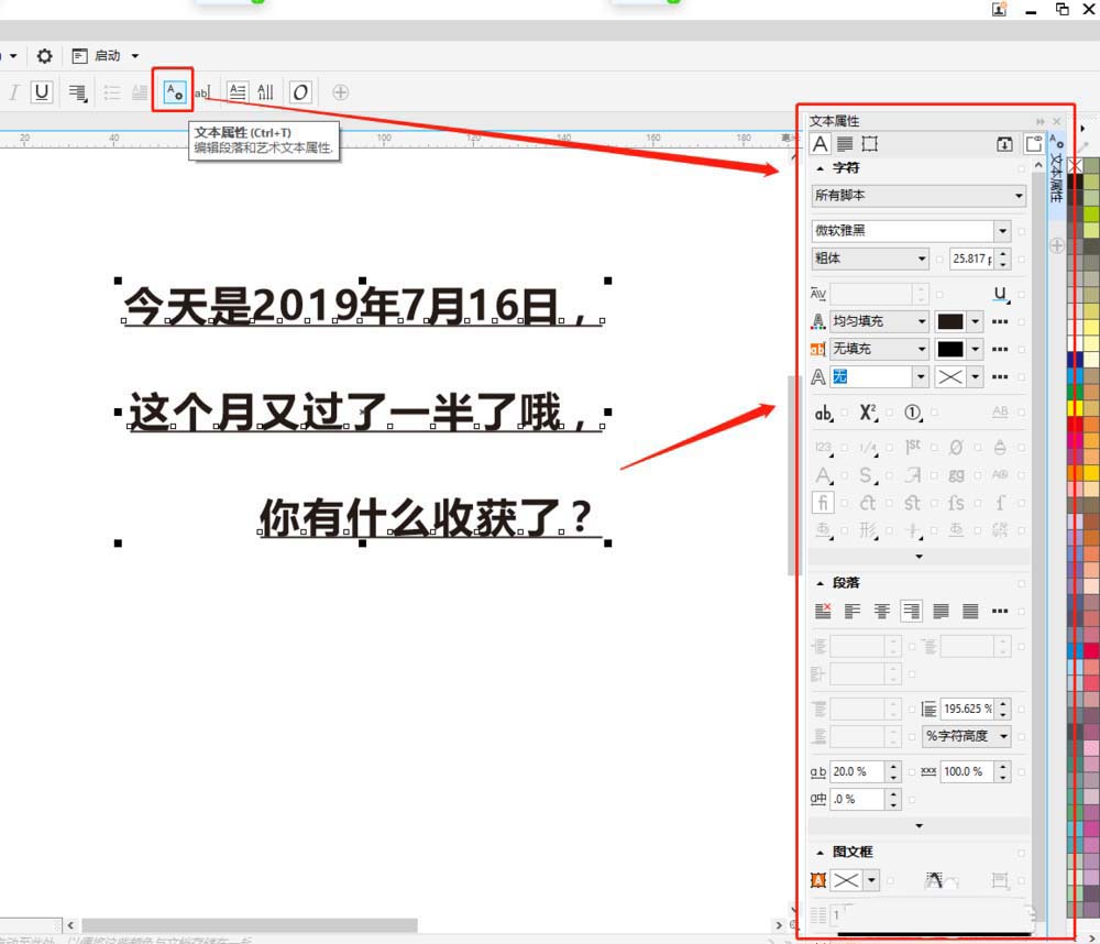 4、點(diǎn)擊屬性欄文本屬性,快捷鍵是【CTRL+T】,可以調(diào)出【文本屬性】泊塢窗,可以在泊塢窗里調(diào)整編輯美術(shù)字屬性。這里的屬性是特別全的哦!