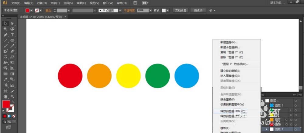 4、用選擇工具選擇所有的圖形,按快捷鍵F7、彈出圖層面板,下拉右上方的三角下拉列表,選擇“釋放到圖層(順序)”。