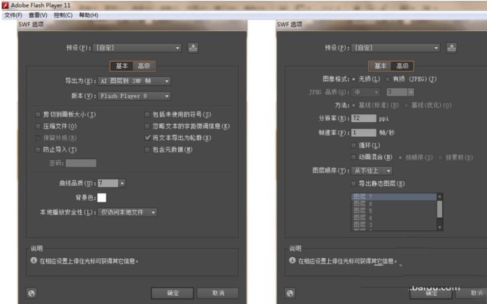 6、彈出一對話框,設置基本屬性,導出為:選擇AI圖層到SWF幀,再選擇高級,設置分辨率及幀速率,如圖,保存后再打開就是動畫效果。