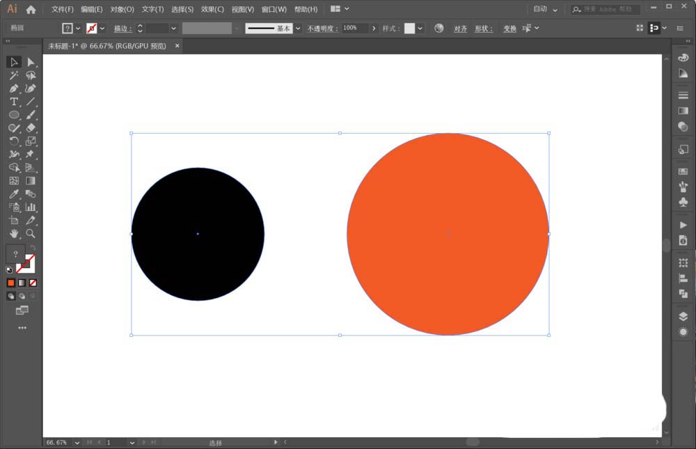 2、進(jìn)入文檔之后,我們使用選擇工具選中需要?jiǎng)偤孟嗲械膬蓚€(gè)圓。分別查看并記住兩個(gè)圓的描邊數(shù)值。