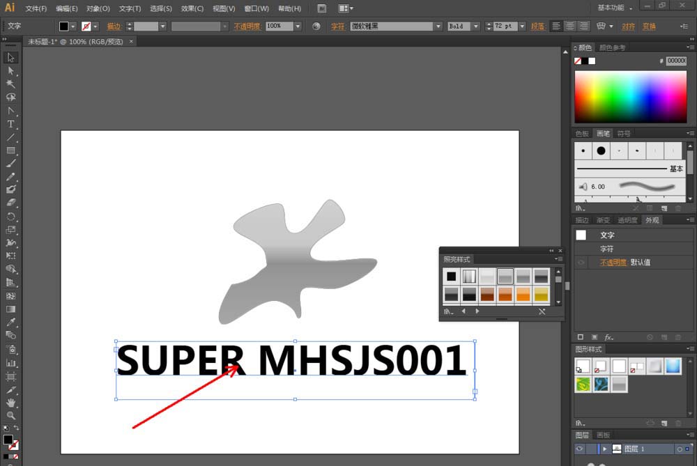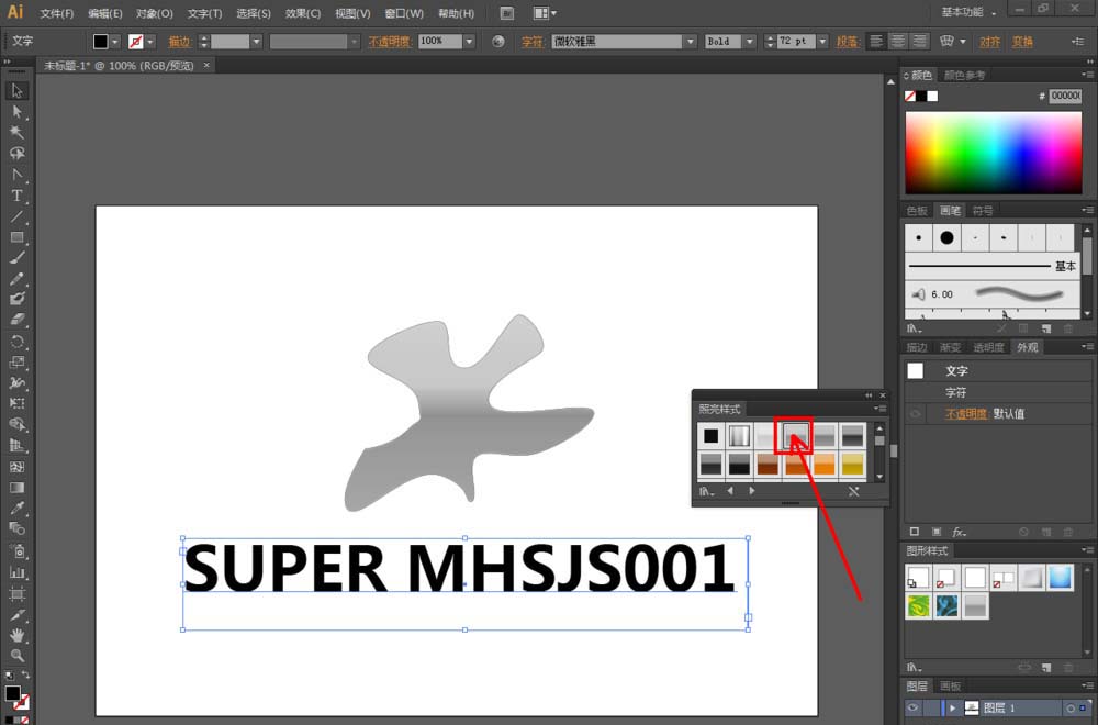5、選中自定義圖案,點(diǎn)擊照亮樣式工具欄中的【鋁質(zhì)高光】,為圖案添加上鋁質(zhì)高光效果。選中“SUPER MHSJS001”文字部分,同樣點(diǎn)擊照亮樣式工具欄中的【鋁質(zhì)高光】,為文字也添加上鋁質(zhì)高光效果。這樣我們就完成了圖案和文字的鋁質(zhì)高光效果制作。