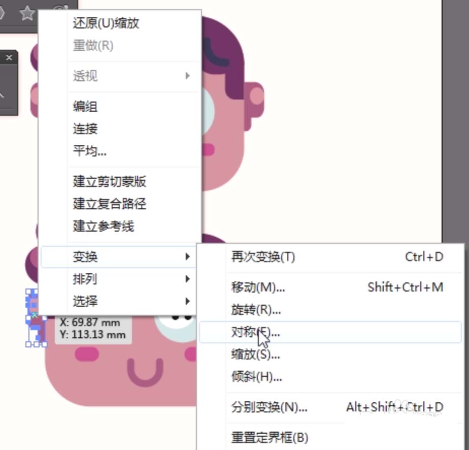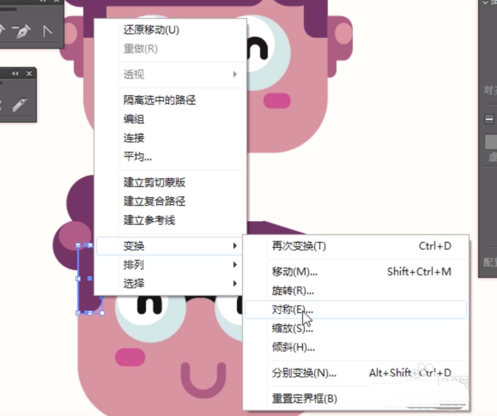 20、選中耳朵的兩個(gè)部分,右鍵變換--對(duì)稱。再?gòu)棾龅目蛑羞x擇垂直,復(fù)制,確定。