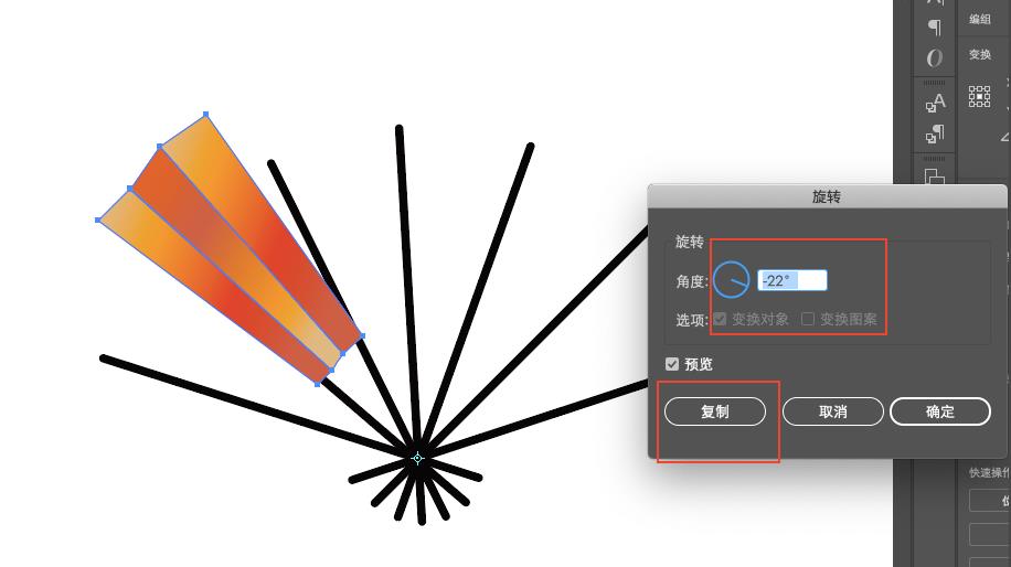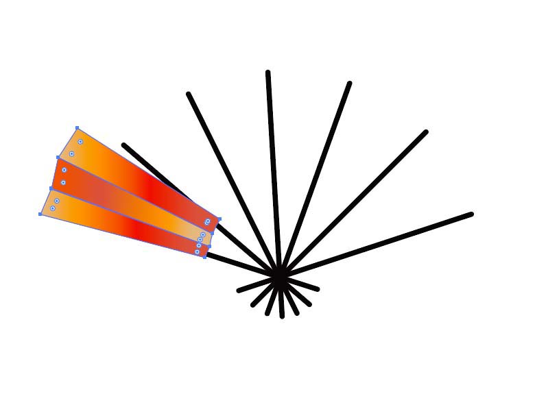 5、用旋轉(zhuǎn)工具,軸心放到扇柄中間,復(fù)制并ctrl+d再制形成扇形。