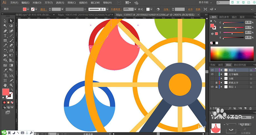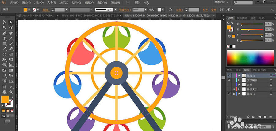 5、這一步,我們使用橙色與藍(lán)黑色搭配填充摩天輪的圓形與下方的三角形結(jié)構(gòu)件的路徑。