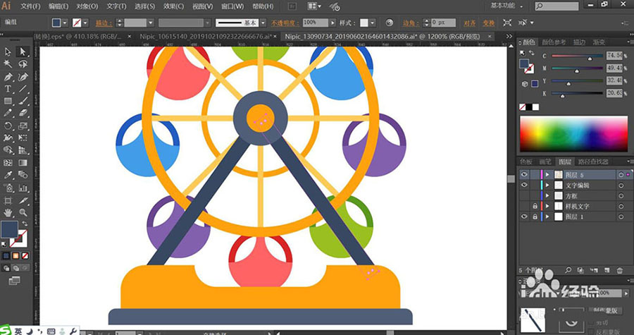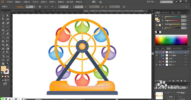 7、最后,我們用網(wǎng)格工具點(diǎn)擊一下摩天輪的各個(gè)小房間讓其呈現(xiàn)漸變色,再點(diǎn)擊一下摩天輪的下方的基座讓其呈現(xiàn)橙黃色的漸變效果,完成摩天輪圖片設(shè)計(jì)。