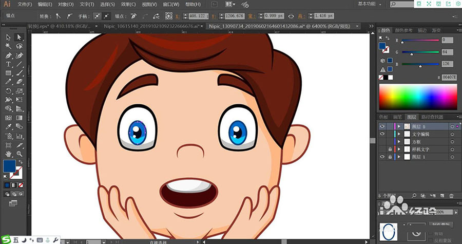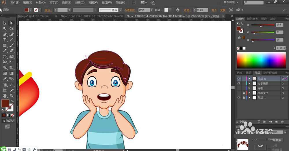 4、使用網(wǎng)格工具點擊一下旋轉(zhuǎn)吊車的紅色與青色的路徑讓其呈現(xiàn)漸變色,使用明暗兩種色調(diào)的紅棕色填充男生的頭發(fā)路徑。