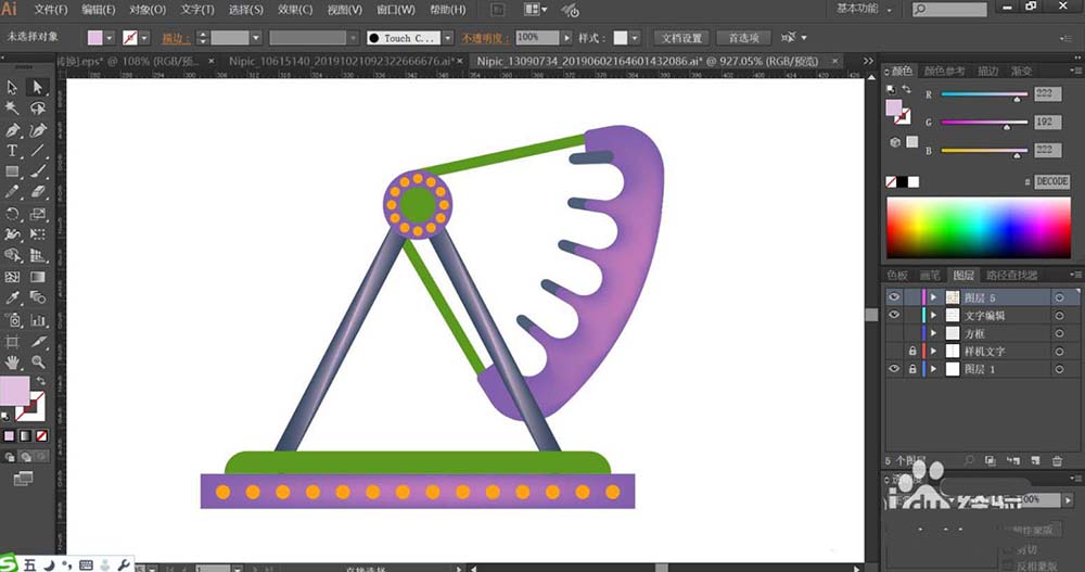 2、使用紫色填充海盜船的座椅與基底的結(jié)構(gòu)件,再用橙色填充圓形的連接件。