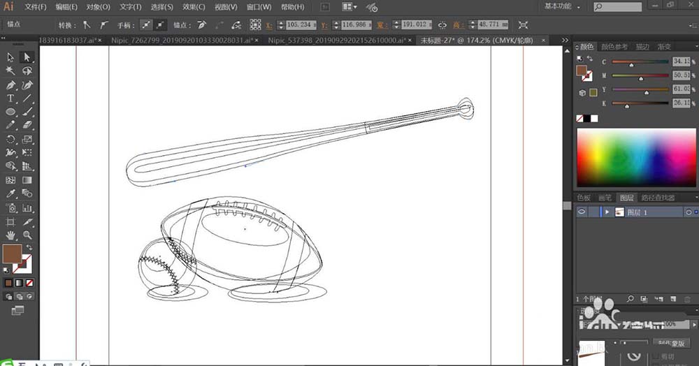 1、使用鋼筆畫出球棍的細(xì)節(jié),再用圓形畫出橄欖球的細(xì)節(jié)路徑,最后,我們畫出球體表面的光線與圖案的路徑。