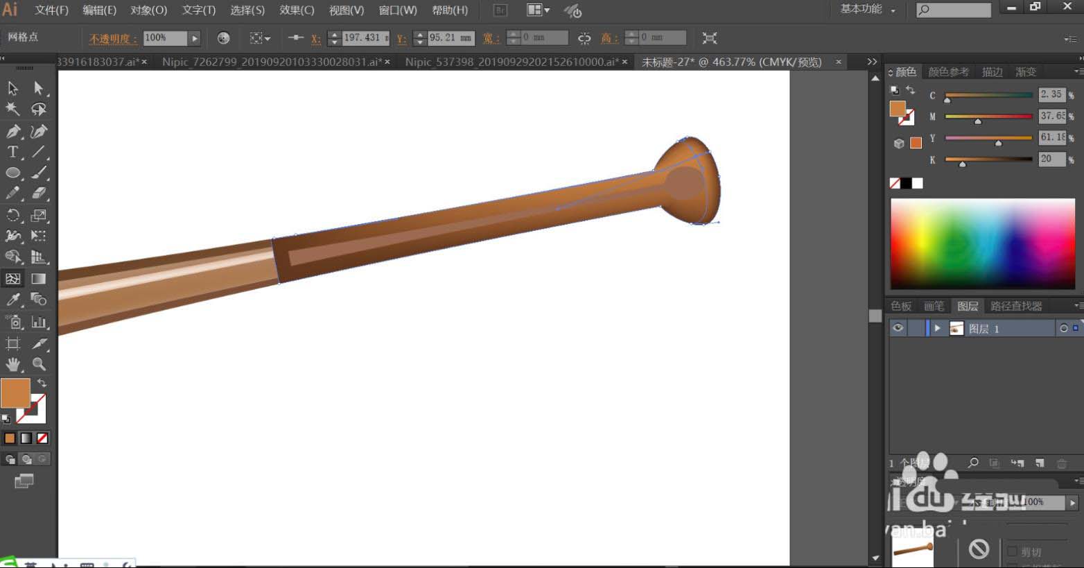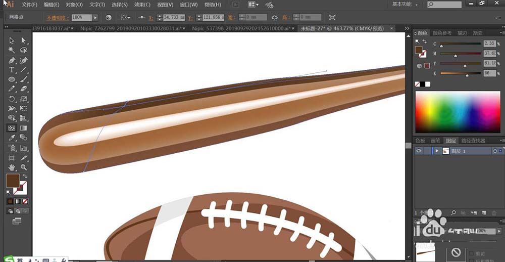 4、再用網(wǎng)格工具點(diǎn)擊一下球棍的右側(cè)讓其呈現(xiàn)咖啡色到黃色的漸變效果。