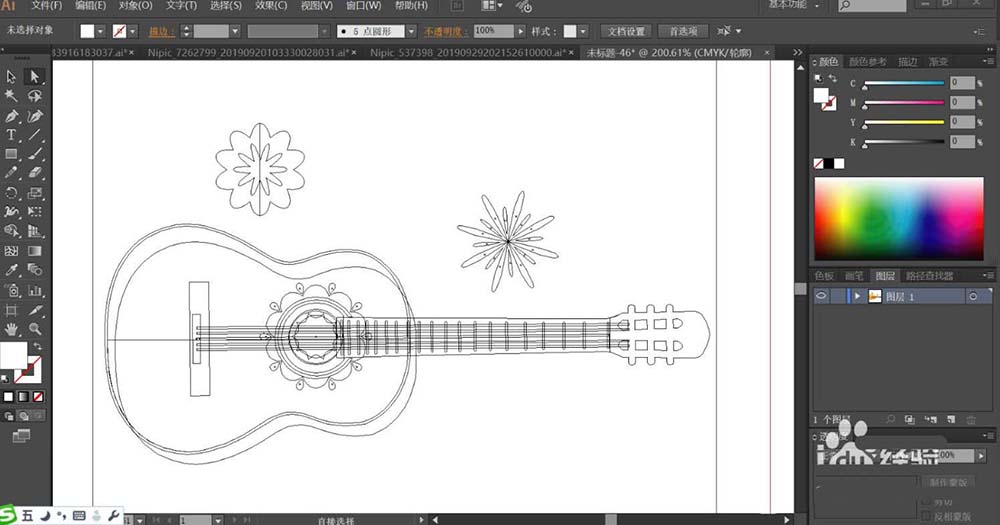 1、使用鋼筆繪制出吉它的大音箱,再繪制出它的琴弦,繼續(xù)繪制吉它的手柄與頂端的細(xì)節(jié)路徑,最后,我們用圓形繪制出吉它上方的兩個(gè)花朵圖案。