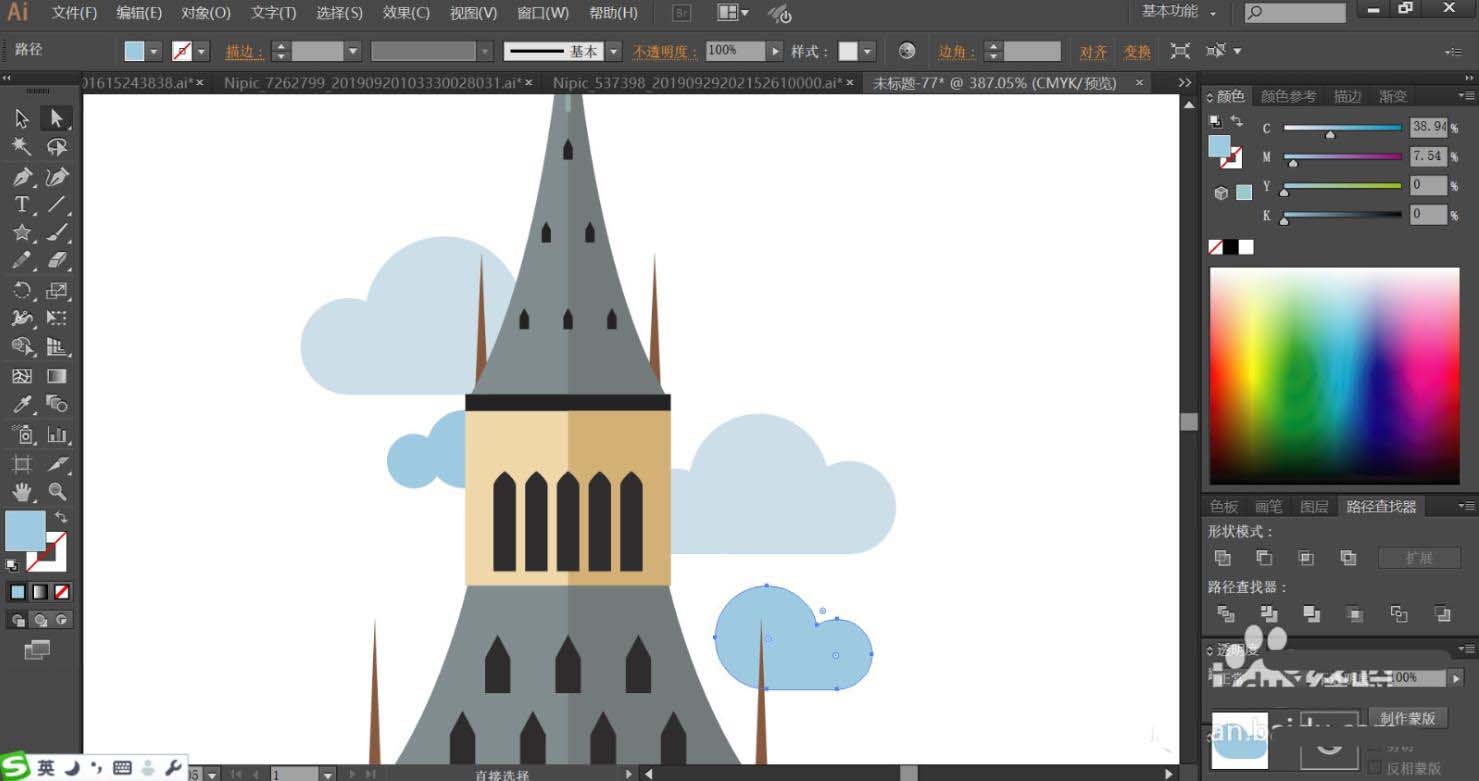 3、使用純藍色與天藍色搭配填充大鐘樓背后的大小云朵,讓云朵有著遠近深淺的效果。