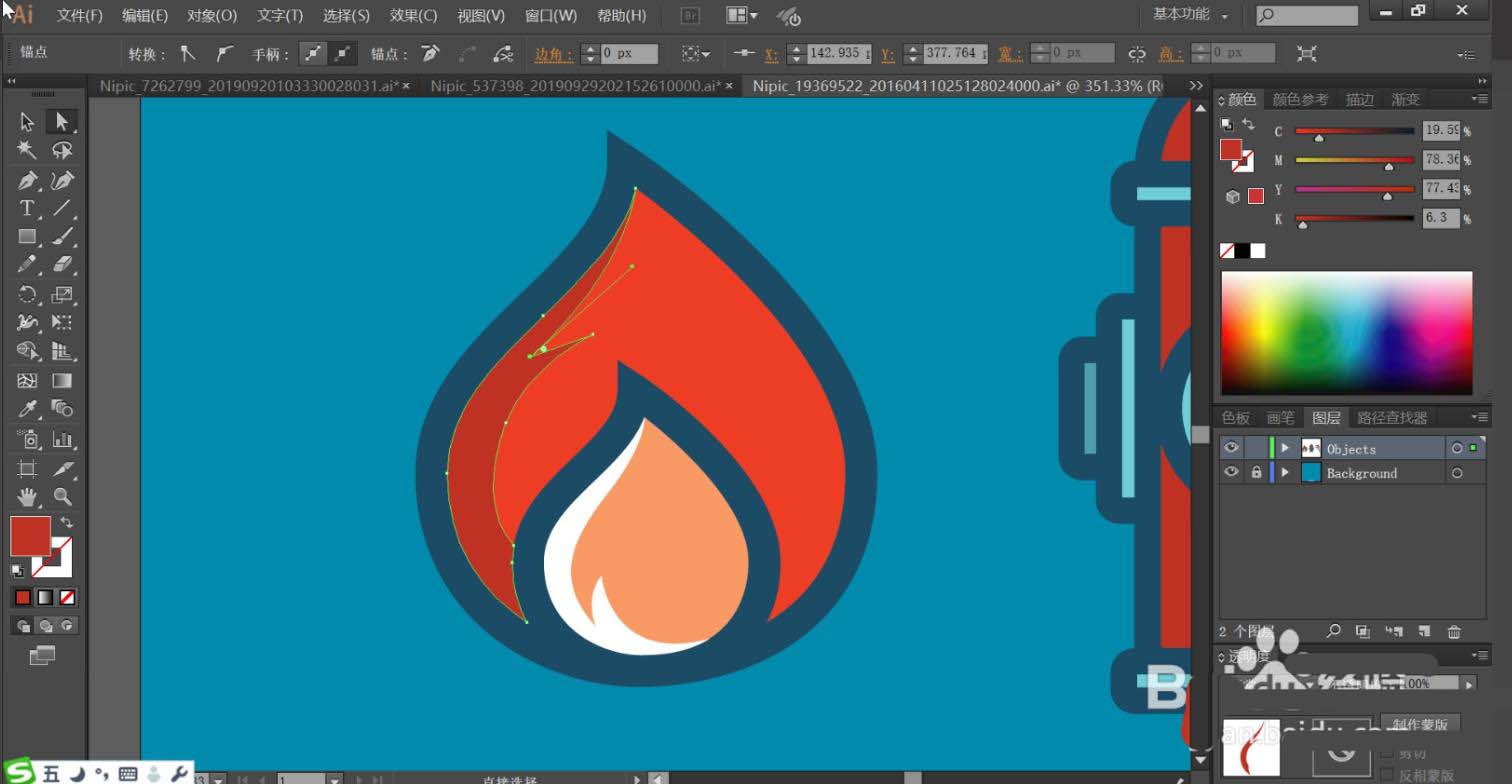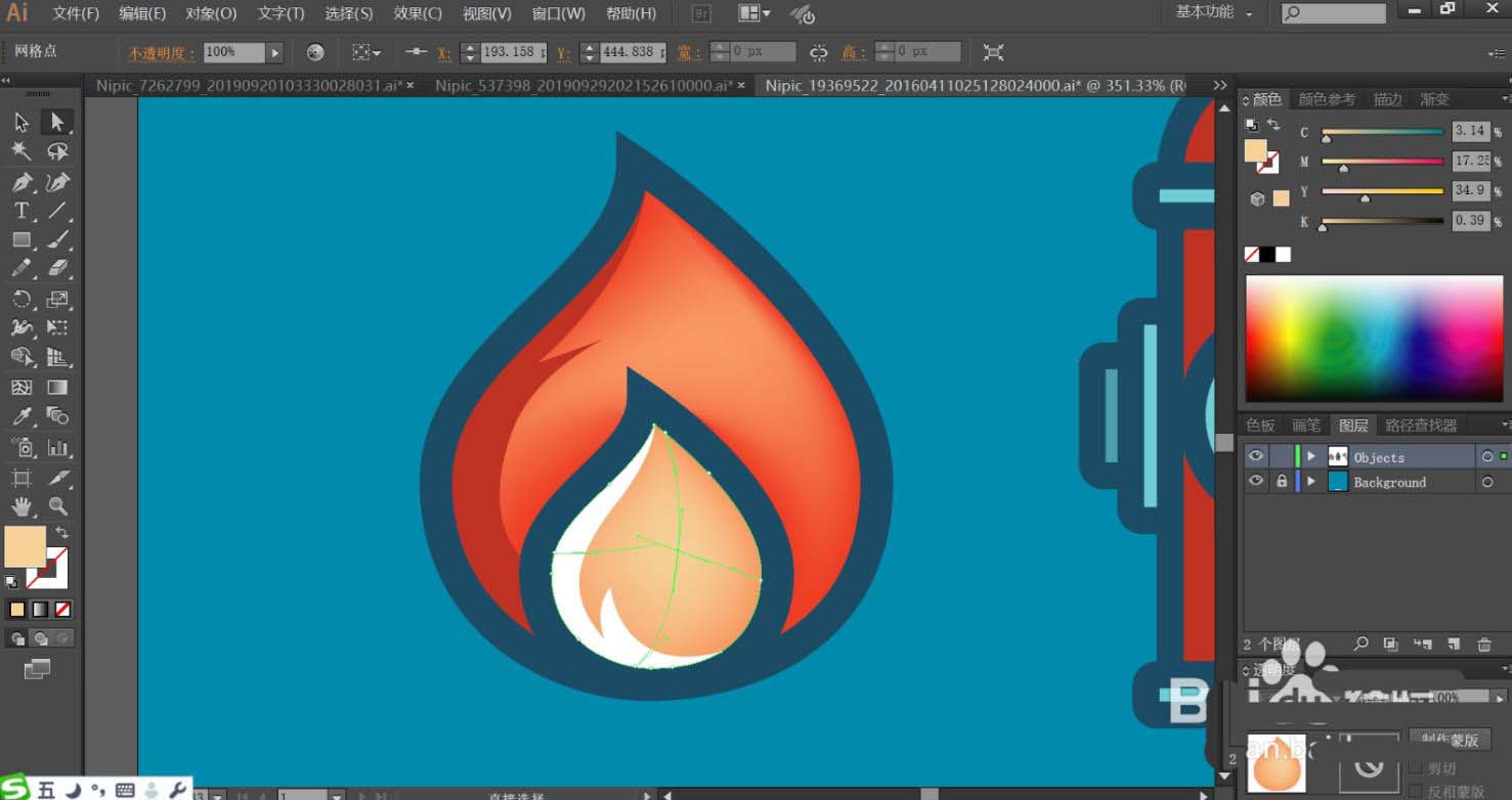 4、使用網格工具點擊一下火苗的紅色區(qū)域與紅灰色區(qū)域讓其呈現漸變色的效果,完成火苗的繪制。