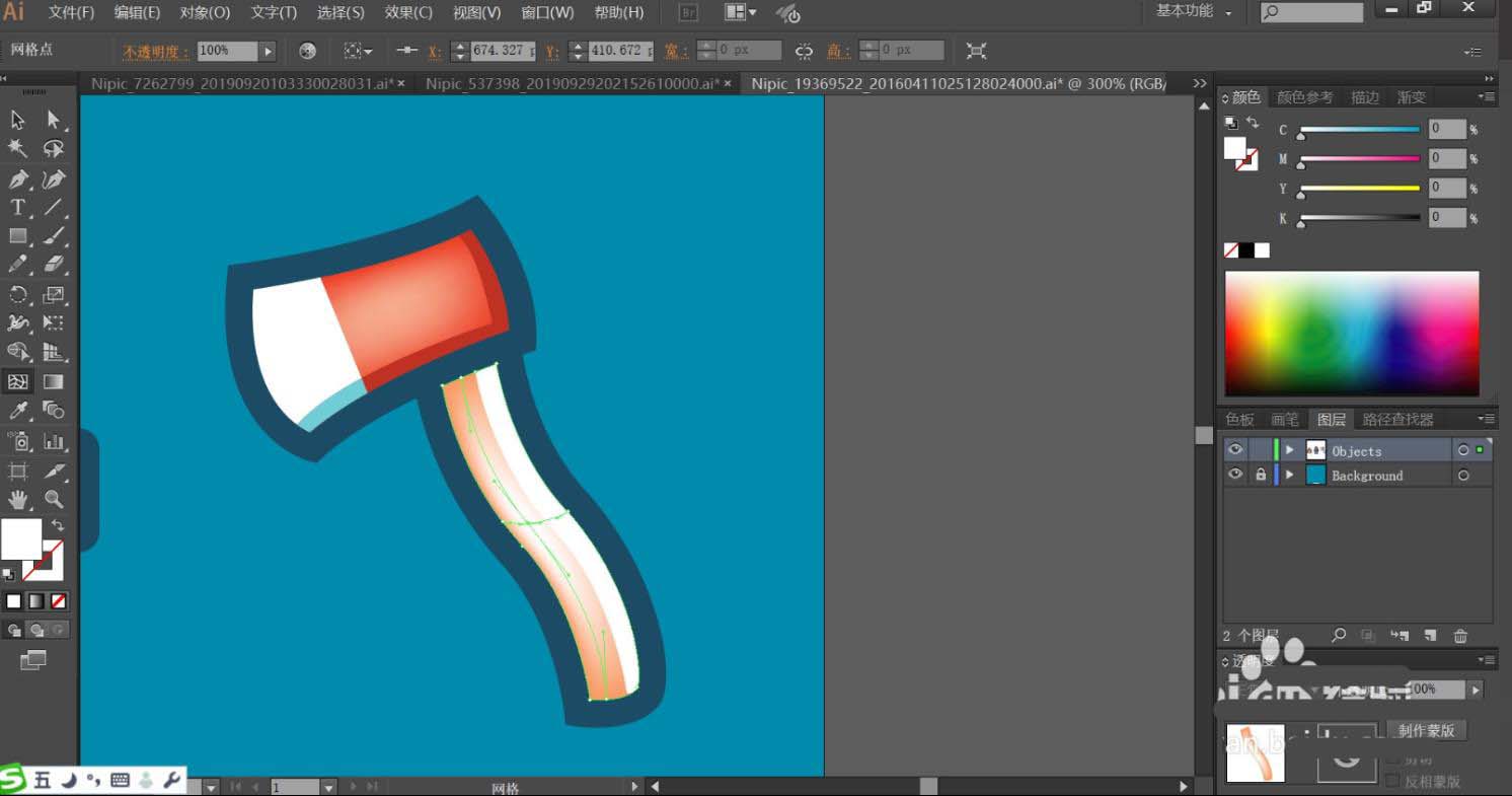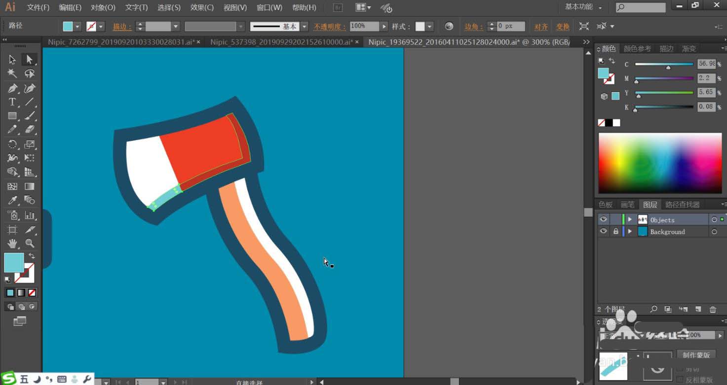 7、最后,我們用紅色、白色填充斧頭的路徑,再用純藍色與暗紅色填充斧頭的下邊緣暗光,使用藍黑色填充斧頭的邊緣,使用紅灰色與白色搭配填充斧頭的手柄路徑,再用網格工具繪制出漸變色效果在斧頭與手柄上面,完成消防素材設計。