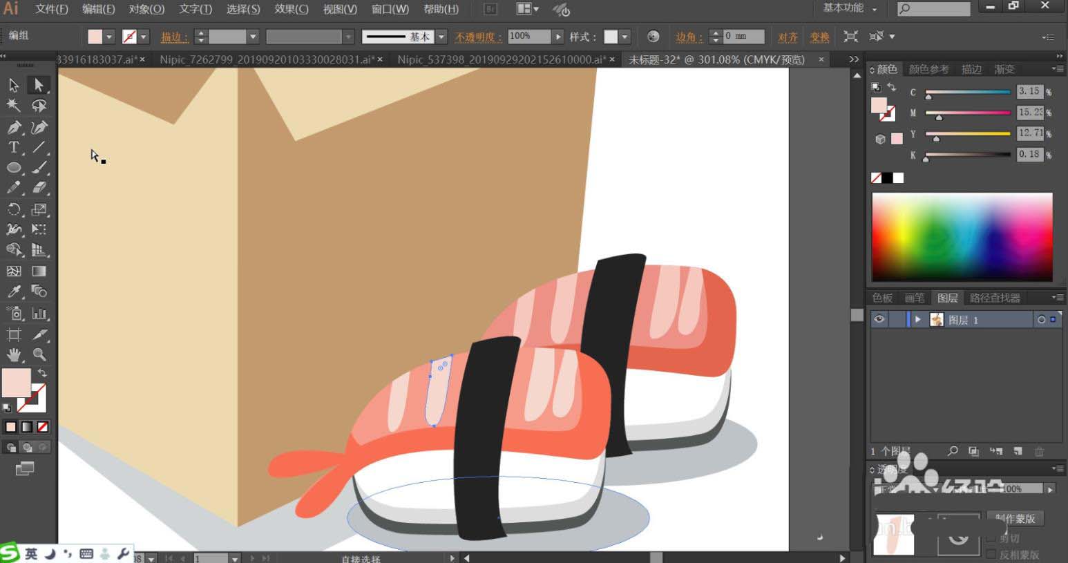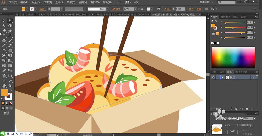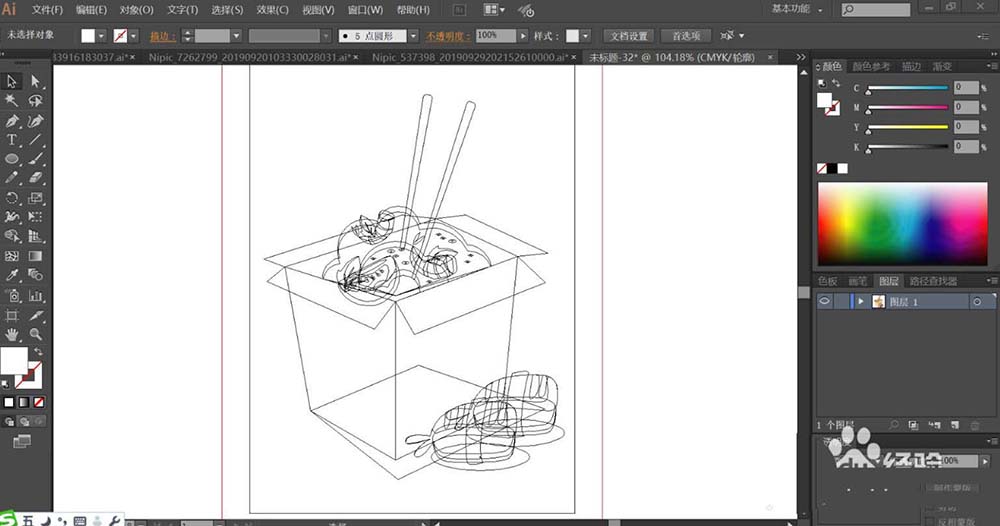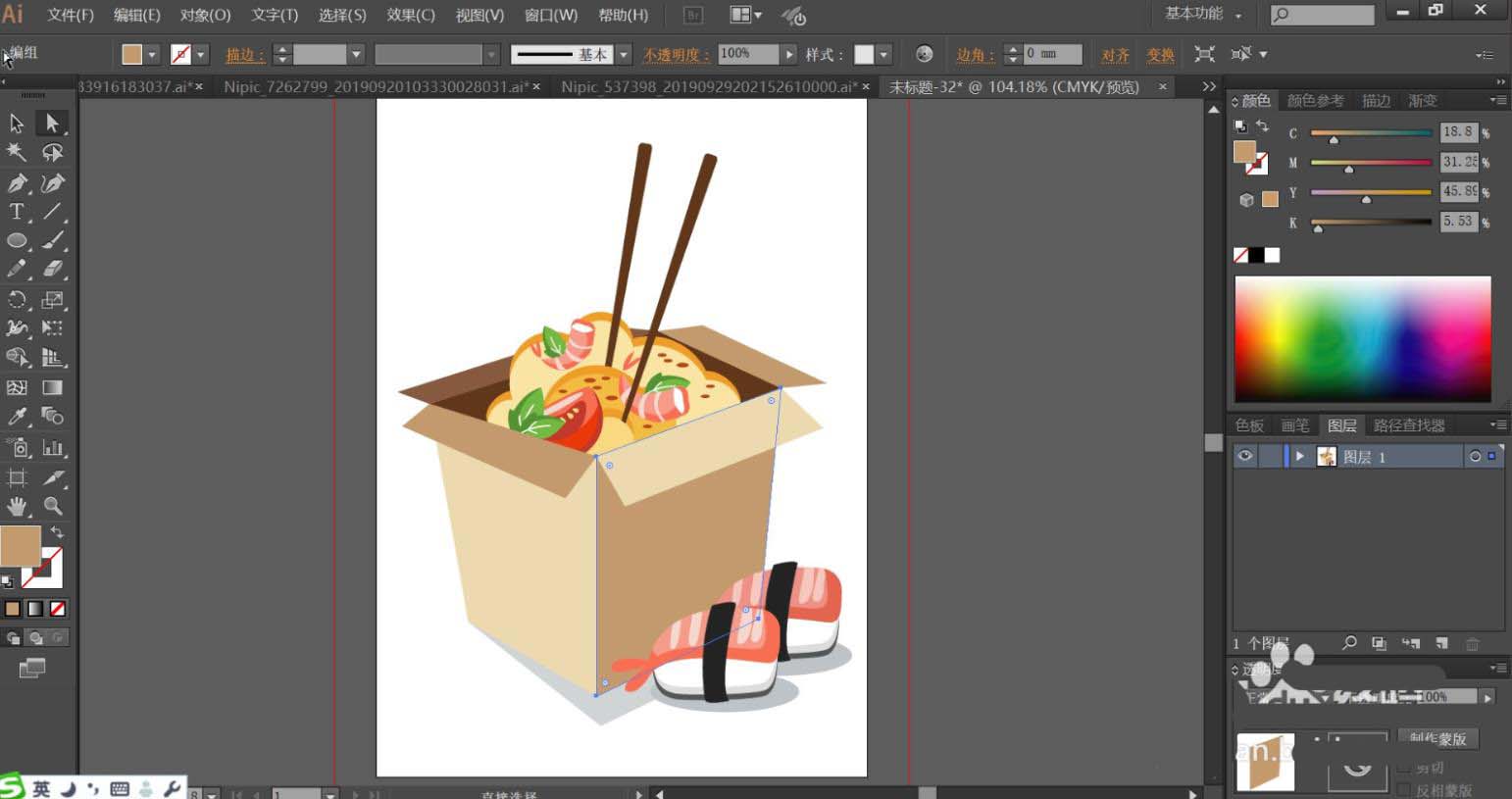 1、使用鋼筆畫出盒子的左側面與右側面,再畫出它的頂端開口不同側面的路徑,繪制盒子內部的面包、蔬菜、肉塊還有筷子,盒子外面的飯團細節(jié)路徑。