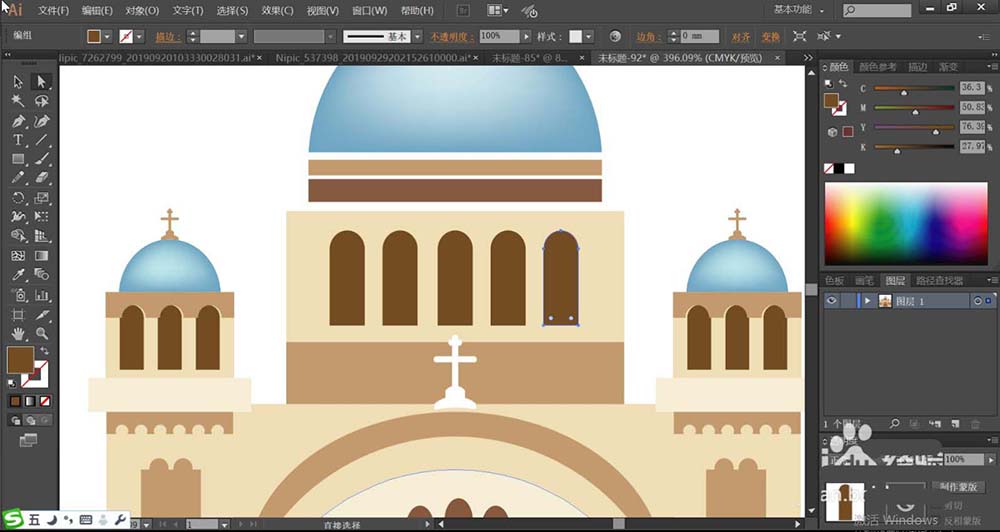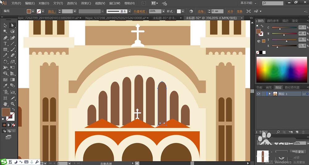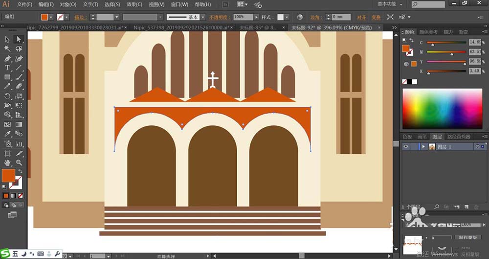 5、這一步,我們使用米灰色填充建筑正中間的拱形結(jié)構(gòu)件,再用灰棕色填充下方的圓角矩形結(jié)構(gòu)件,在結(jié)構(gòu)件下方的尖角使用桔黃色填充。
